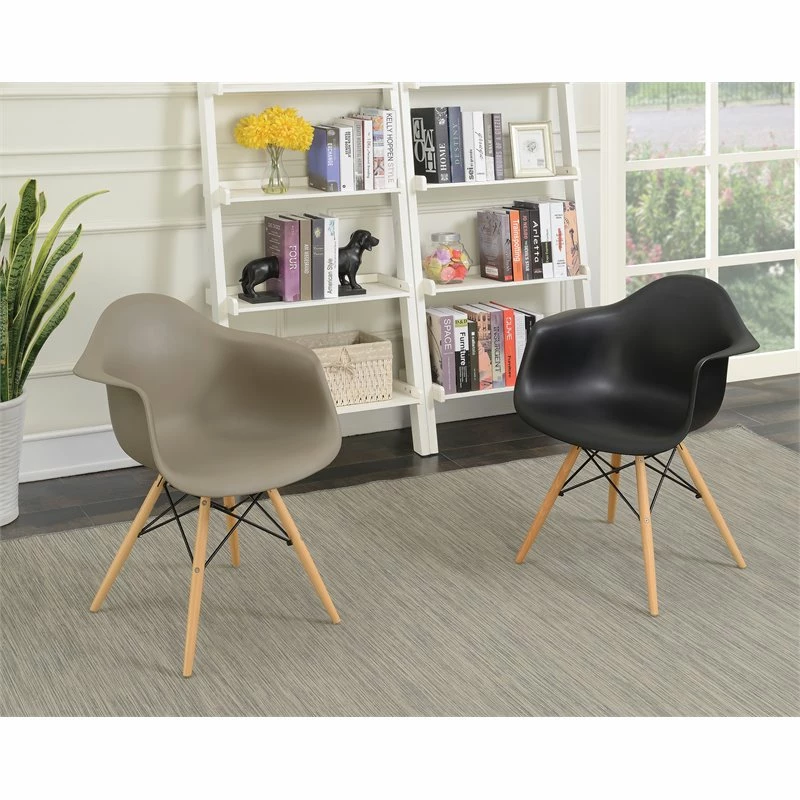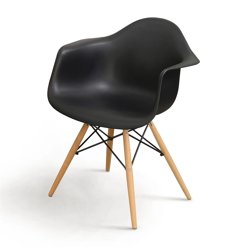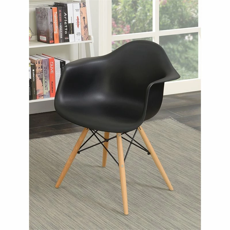 Lounge in comfort with the minimalistic Allora Mid-Century Plastic Dining Arm Chair. Available in multiple colors, the black Dining Arm Chairs features a smooth rounded framework that instantly streamlines the appearance of your home. Natural tone turned legs are accented by darting steel supports for a look that is stylish as it is sturdy.