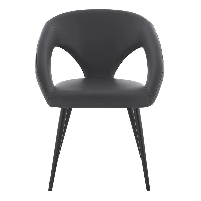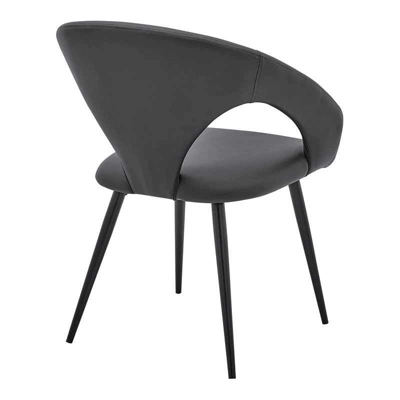 The Elin Grey Faux Leather and Black Metal Dining Room Chairs from Armen Living is the sophistication and refinement your dining room has been looking for. The seatback is curvy and clean – leaving you with a unique image of exuberance. The Elin features slotted sides that offer you an incredibly breathable seating experience. The metal frame is strong and stable and its accents are pleasing to the eye. The seat cushion is filled with foam padding – keeping you and your guests comfortable and relaxed while you visit with them. The Elin dining chairs come as a set of 2.
