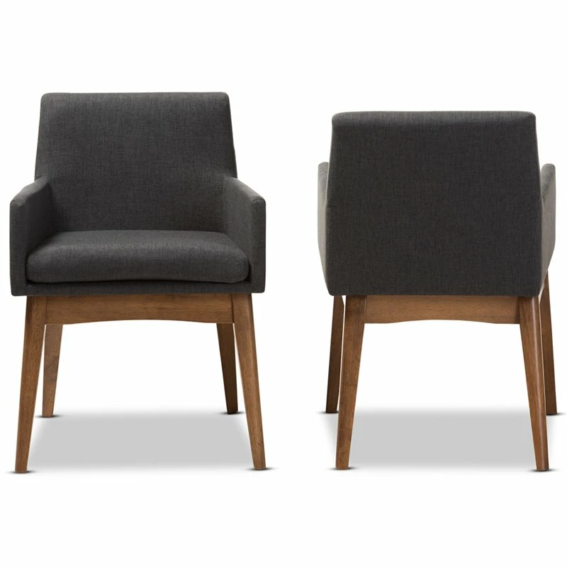 Enriched with finer detailing, the angular and cushioned Nexus dining armchair embraces comfort. Constructed of solid rubber wood frame in dark walnut finishing, the Nexus is upholstered in dark Gray polyester fabric. It’s splayed leg design sets the stage for a mid-century modern appeal to your dining room. Comfortable foam padded seat and back for lasting comfort in enjoying everyday family dinners. Medium seat back that seamlessly tapers down creates a look of modern aesthetic. Made in Malaysia, the Nexus dining armchair requires assembly.