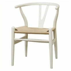 This dining chair features traditional wood and is paired with a modern design, resulting in a unique piece for your home. The frame consists of solid wood with an ivory white coat finish, a comfortably-curved backrest, and sturdy natural unfinished hemp seat. This item will arrive fully assembled.