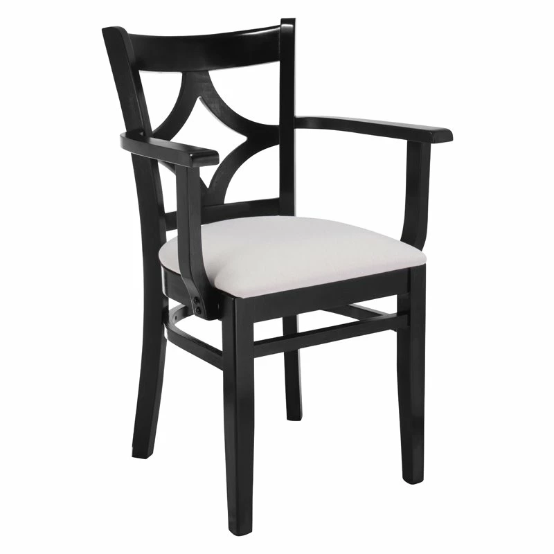This arm chair is crafted of solid beech wood. Finished in black and upholstered in easy care cream faux leather seat. The rich color and clean lines make this a very versatile piece that could work with modern, contemporary, and traditional decor. It comes fully assembled and 350 lb weight capacity.
