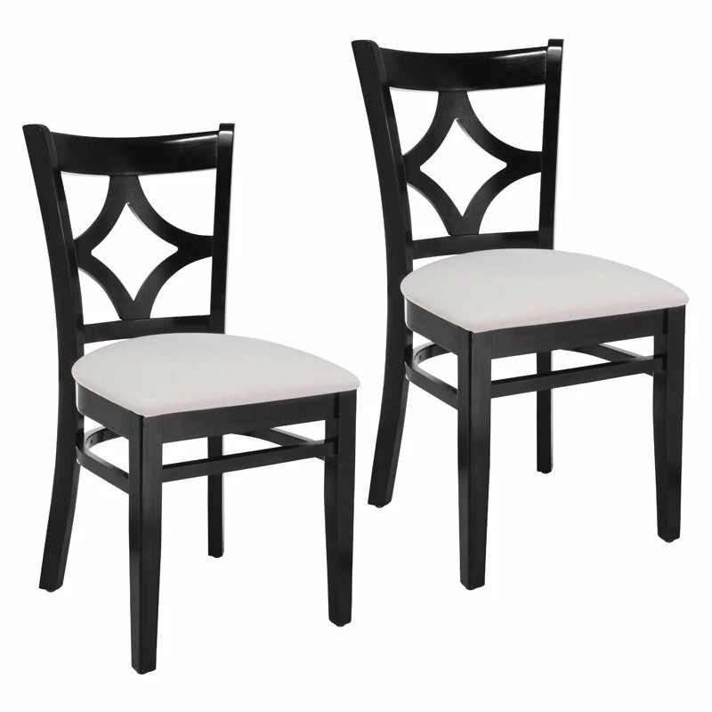 This set of 2 Curtain Back side chair is crafted of solid beech wood. Finished in black and upholstered in easy care cream linen. The rich color and clean lines make this a very versatile piece that could work with modern, contemporary, and traditional decor. It is strong quality, comes fully assembled and 350lb weight capacity.