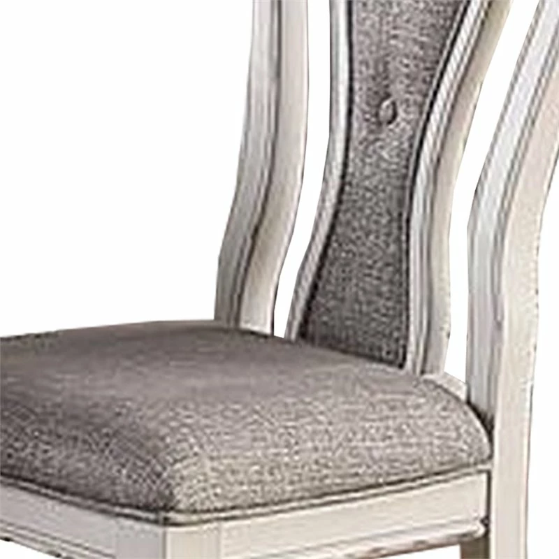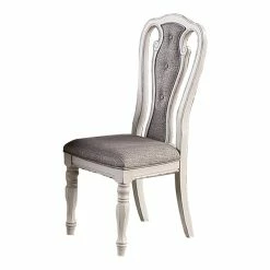 Introduce your home t this very stylish and attractive dining chair and add charm to your dining room. The dining chair is supported on flared and turned legs and has a scrolled design backrest that features upholstery with fabric tufting. The padded upholstered seat makes sure comfort is not compromised with style.