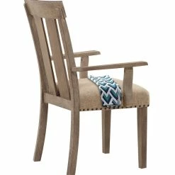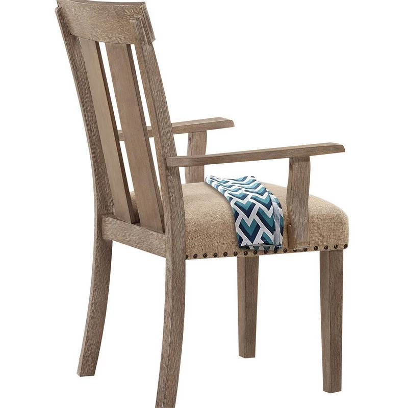 Create a rustic look in your dining room with this Set of 2 Dining Side Armchairs. Made up of wood and finished in brown, these chairs feature slat style backrest, straight armrests and fabric upholstered padded seats that are adorned with nail head trim.