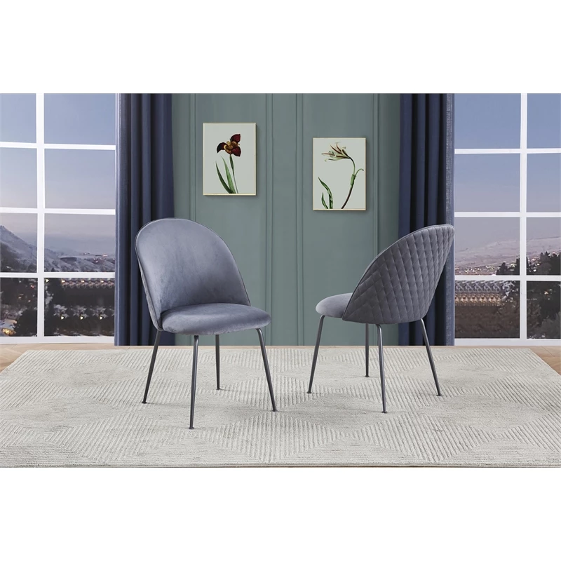 Set of 2 upholstered standard height side chairs with gray painted legs and quilted chair backs. Chair upholstery is available in Dark Gray Velvet, Beige Velvet, and White Faux Leather.