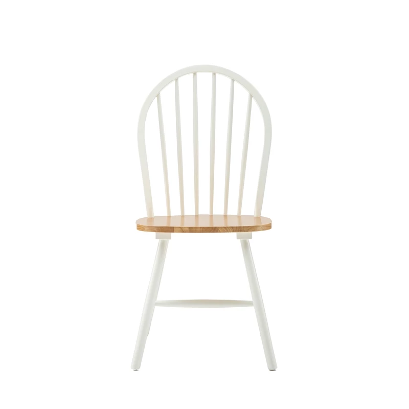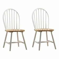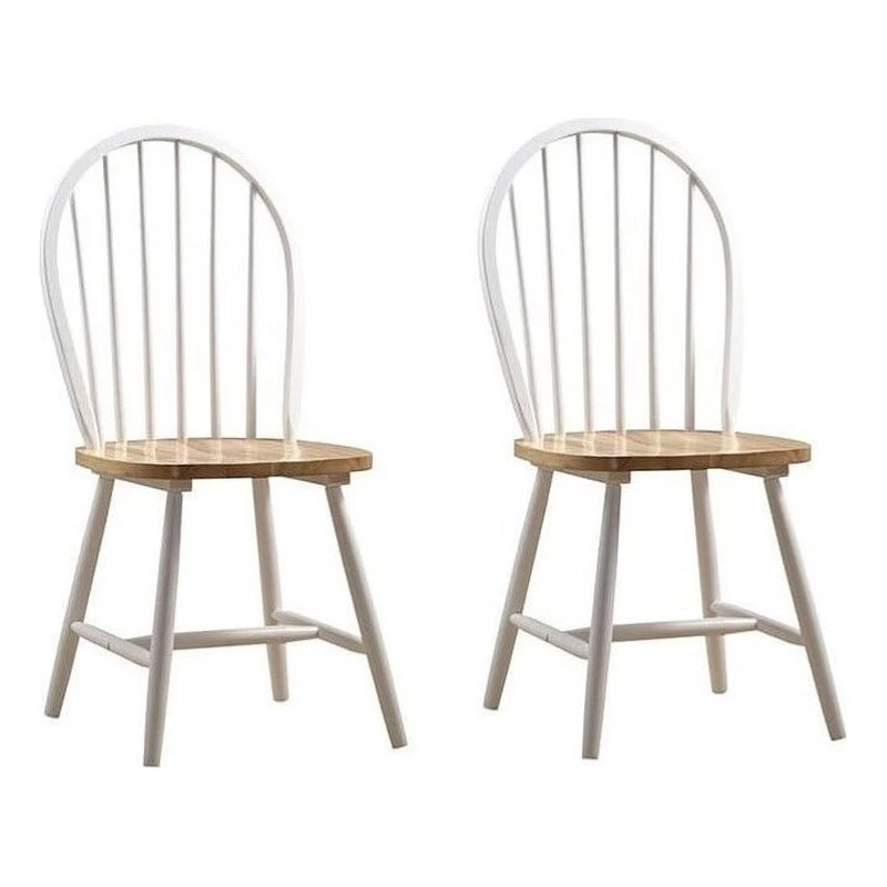 This delightful Farmhouse Chair captures the simplicity and elegance that makes farmhouse style an enduring classic. The Windsor-inspired chairback has a classic spindle design. It comes in a two-toned finish, with a glossy, polished wood seat which is shaped for comfort. This dining chair is made from solid hardwood to ensure it can withstand years of family dinners and Sunday brunches. Choose your preferred color combination: White & Natural or Black & Cherry. Comes in a set of two matching chairs.