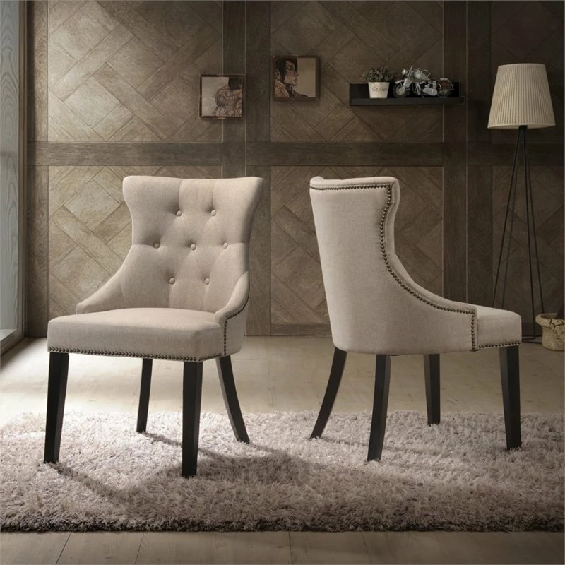 The Julia Dining Chair is a well-built, elegant chair with hand-placed button tufts and comfortable padding. It’s covered in a Cotton/Linen Blend fabric with hand-applied nail head trim, and it’s hardwood legs are gently tapered and curved.