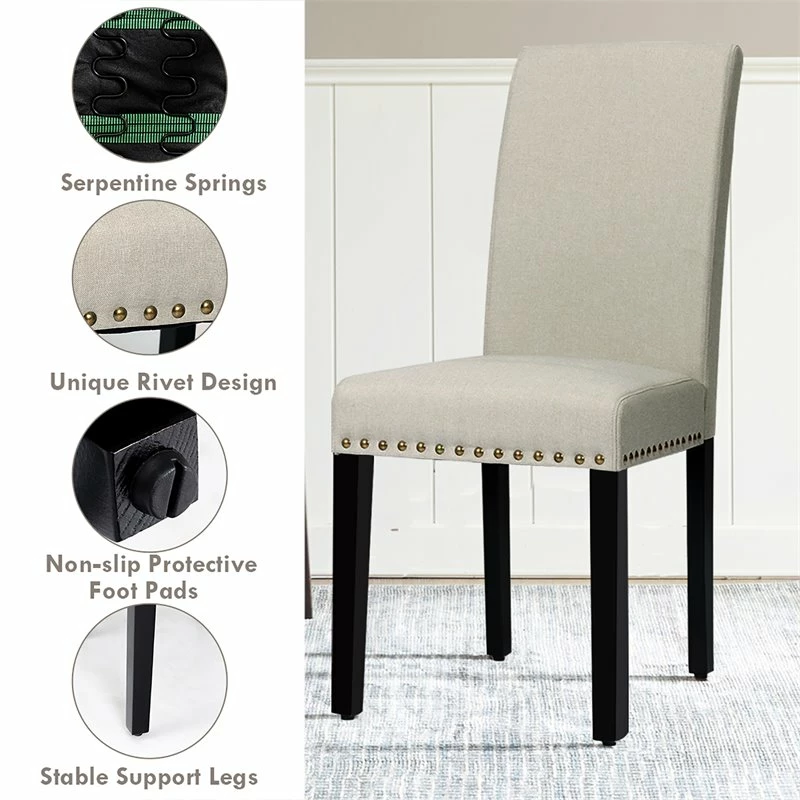 High Density Sponge & Linen Fabric: These 2 dining chairs are filled with high density sponge to offer optimal softness and elasticity. And serpentine spring under the seat make chairs more resilient. Besides, covered with breathable linen fabric, these dining chairs will provide maximum comfort. Stable & Durable Structure: This dining chair set is supported by premium solid wood legs to ensure good sturdiness and durability. It can withstand up to 330 lbs without wobbling. And adjustable foot pads enable the dining chairs to keep stable on the uneven ground. Ergonomic and Clever Design: The 2 dining chairs are designed with ergonomic curved backrest, which can perfectly adapt to your back and spine for great relaxation. Moreover, wide seat and seat height are sized to meet different needs, creating a more comfortable feeling. Stylish Design for Versatility: The rivet design around the seat adds a touch of luxury and beauty to your home. With simple and elegance style, this dining chair set can match with all types of furniture. It is perfect for your kitchen, dining room, restaurant, bistro, cafe and more. Easy to Assemble: This dining chair set comes with a clear and brief instruction, which has straight forward illustrations and descriptions. Each screw and part has its own code to let you easily understand the assembly progress, taking you little time and energy.