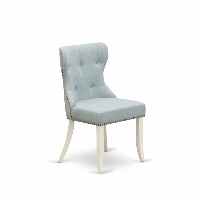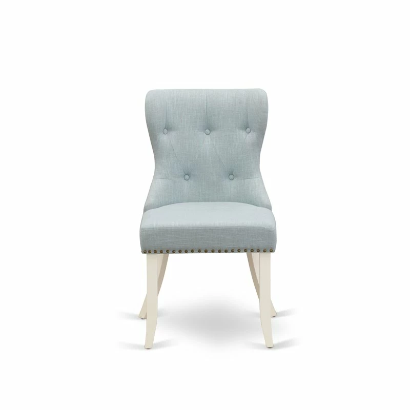 The parson chair is a classy way to add extra seating wherever you need it. This parson chair consists of linen fabric seat with nail head, button tufted back and wooden 4 legs. Produce an attractive charm to your dining area with the help of our fantastic mid century dining chairs. The innovative button tufted back structure of these mid century dining chairs will increase the beauty of any dining room table. Cozy seat of these wooden chairs will give an excellent sitting experience and the back makes full support to your back. The structure of these dining room chairs are manufactured from high-quality Asian wood (rubber wood), which give amazing sturdiness and steadiness to these wooden dining chairs. Soft and comfortable foam padded seat of these awesome parson chairs are covered by top quality baby blue linen fabric which offers a wonderful appearance and comfortable sitting experience. Innovative sturdy wood structure, cozy linen fabric seat with nail head, elegant back and sturdy classy legs deliver modern seem to your living room, excellent steadiness to these incredible dining room chairs, and comfortable support to your back. Because of the amazingly sizes these kitchen chairs are very simple to carry, clean, build and change their locations. Timeless designs of these dining room chairs fit well with any decor and a soft cushion upholstered in smooth linen fabric will keep customers cozy.