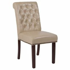Refresh the look of your home, or home office, with the old world charm of this classic beige Leather. Soft upholstered parsons chairs. Leather. Soft is leather and polyurethane for added softness and durability. The rolled, button tufted back and brass nailhead trim lend an upmarket look that is sure to please. Beauty may be only skin deep but this parsons chair is more than a pretty face. The solid hardwood frame construction holds up to 300 lbs. static weight to accommodate most users. Solid wood legs in a walnut finish round out the overall appeal of this timeless piece. Assembly of your new chairs takes less than 30 minutes for quick setup. Maintain the look of these side chairs with a water based cleaner to remove soil or spills. Designed for home use, this accent chair is comfortable, durable and attractive enough for any living space.