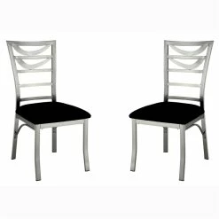 Give your dining room or kitchen a touch of modern contemporary glam with this set of two stainless steel side chairs in silver from Furniture of America. A uniquely designed ladder back with curving accents lends the appearance of contemporary sculpture to any decor. The plush, black microfiber seats perfectly complement the satin metal frame. Padded with foam fill, the chairs offer lasting comfort and style.