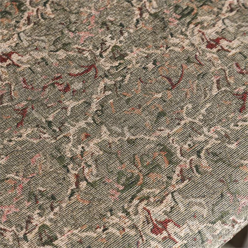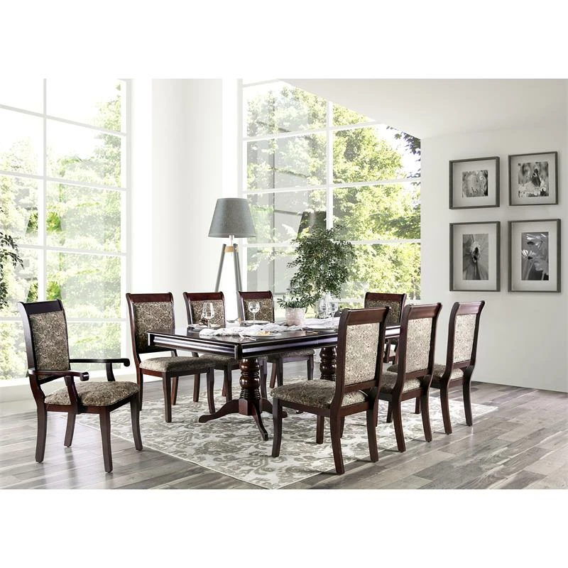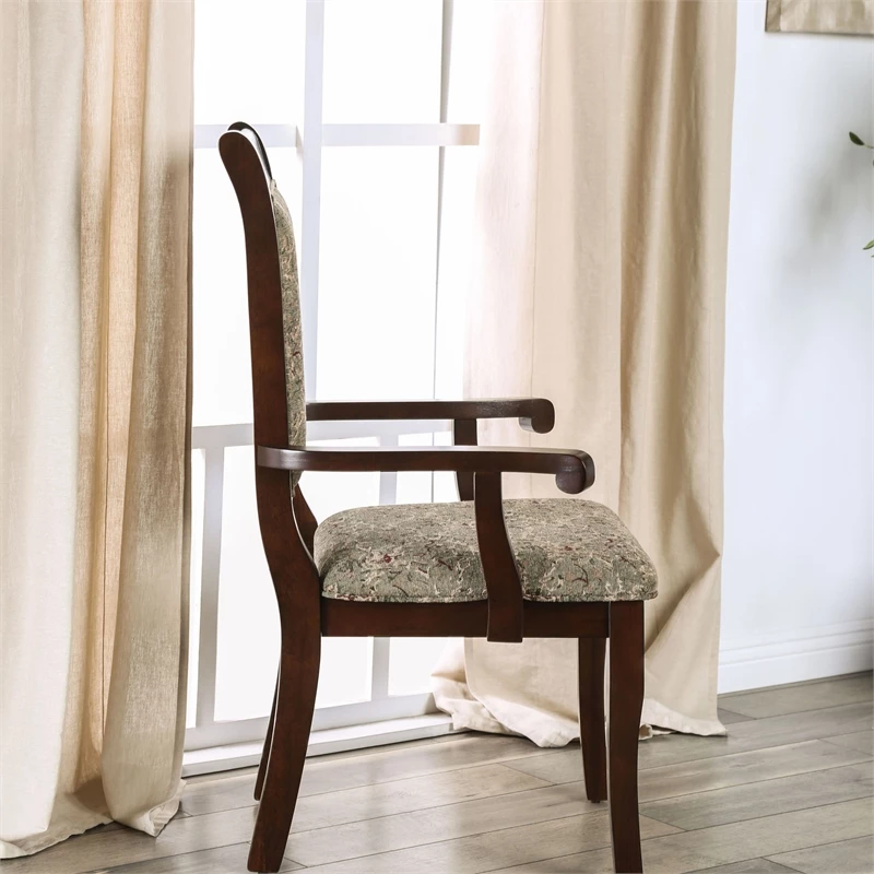 Elegance invites you to rest and relax in the form of the antique cherry finished wood arm chairs. The gently curved backs create a great support for tired backs while you lean against padded fabric cushions that cradle every inch of your tired frame.