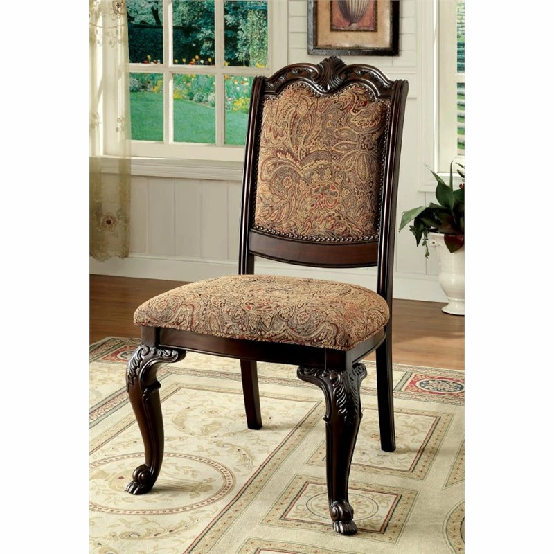 Your search for gorgeous traditional dining chairs is over. This set of two upholstered dining chairs is beautifully coated in a brown cherry finish and include fabric seating. They’re the perfect wood dining chairs when you’re looking to add a touch of elegance to your dining space. Take note of the ornate details around the legs and frame. Impressive, don’t you think?