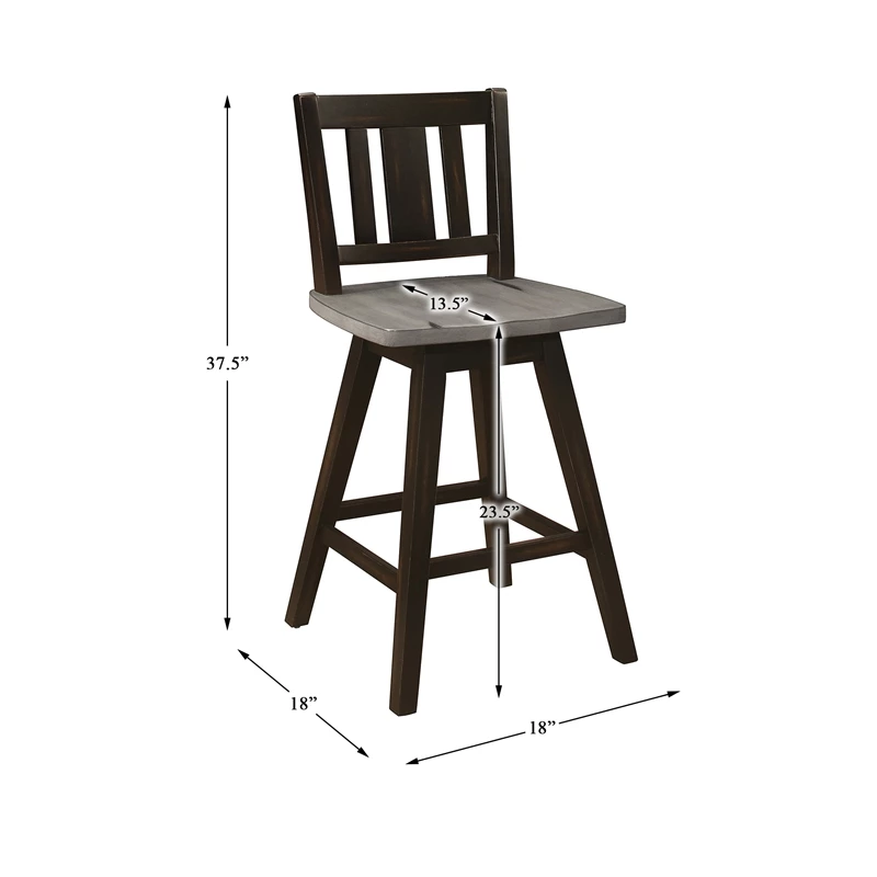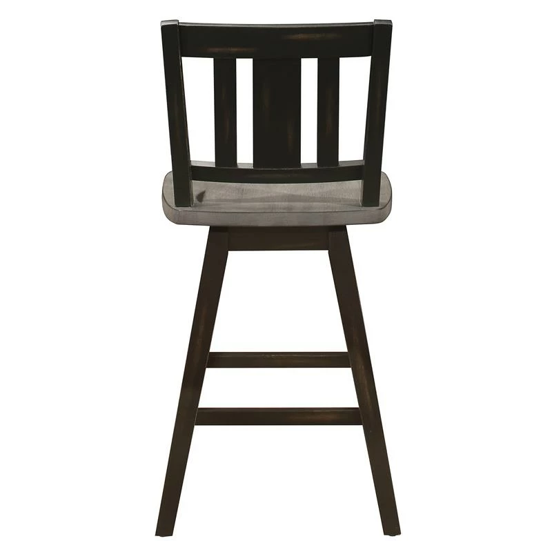 Creating a subtle rustic look for your dining space is the Amsonia Collection. A black sand-through finish graces the solid rubberwood 24-inch swivel vertical slat-back counter height chair, highlighting the veneer.