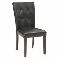 The casual Decatur Collection is the transitional style that you have been searching for in your dining space. Basswood veneer covers the legs, with an espresso finish, that support the classic profile of the chair seat, which is covered in dark brown bi-cast vinyl, with tufted accenting.