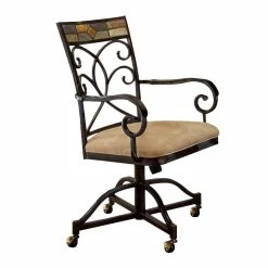 Elegantly designed for the traditional dining room is the Lordsburg Collection. Dark brown faux leather covers the seats and backs of the wood-framed chairs while the magnificent parquet veneer is highlighted by the brown cherry finish.