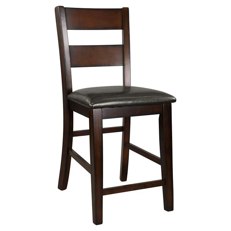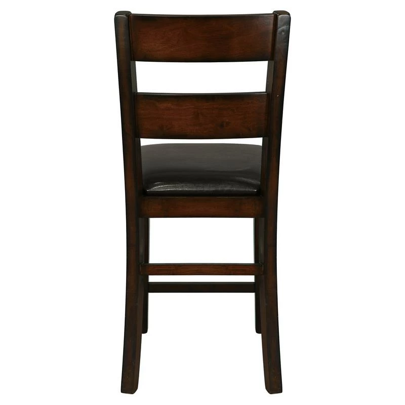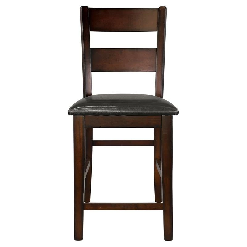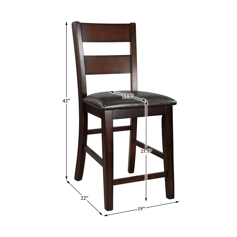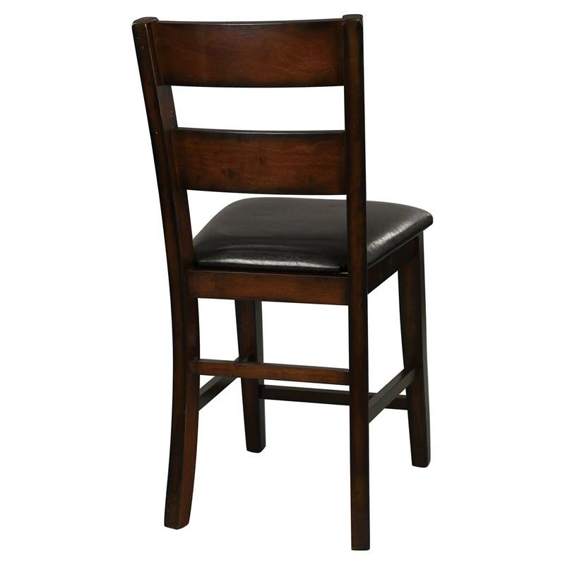 Transitionally styled for your home is the Mantello Collection. The counter height chair’s cherry finish over mango veneer and classic styling will provide the perfect seat for your mealtime gatherings. Dark brown bi-cast vinyl covers the side chairs for complementing contrast to the wood’s finish.