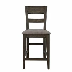 Sit in comfort and indulge in rustic style with the Double Bridge slat back counter chair. Crafted of rubberwood solids, this piece features a dark chestnut finish, grey linen upholstery on the seat, and nylon chair glides to protect your flooring.