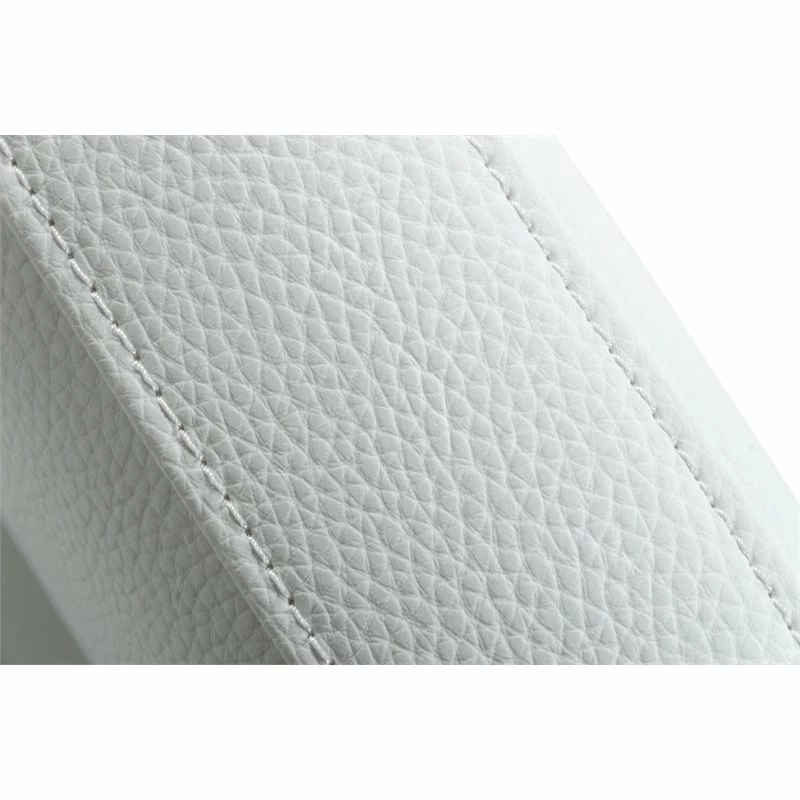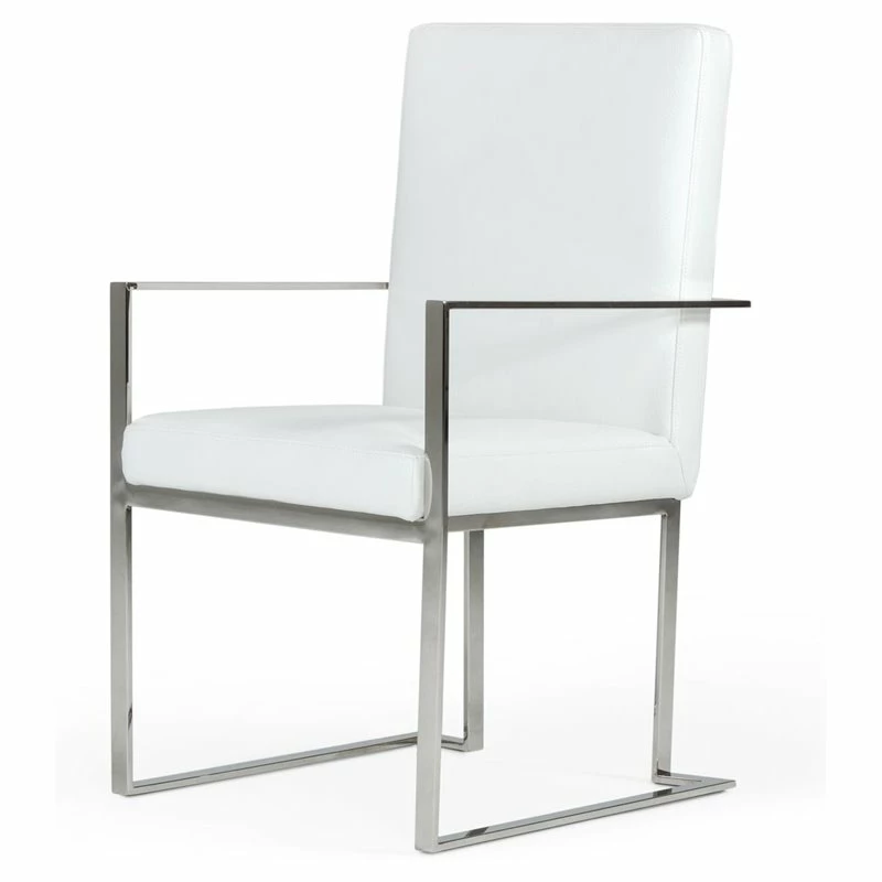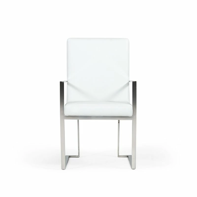 The Fowler Dining Chair is a simple leather dining chair with an elegant frame and beautiful upholstery. The white eco-leather cushioned upholstery of these dining chairs makes them comfortable and elegant. Sure to turn heads with the brushed stainless steel exposed frame. It is the perfect addition to your glam home.