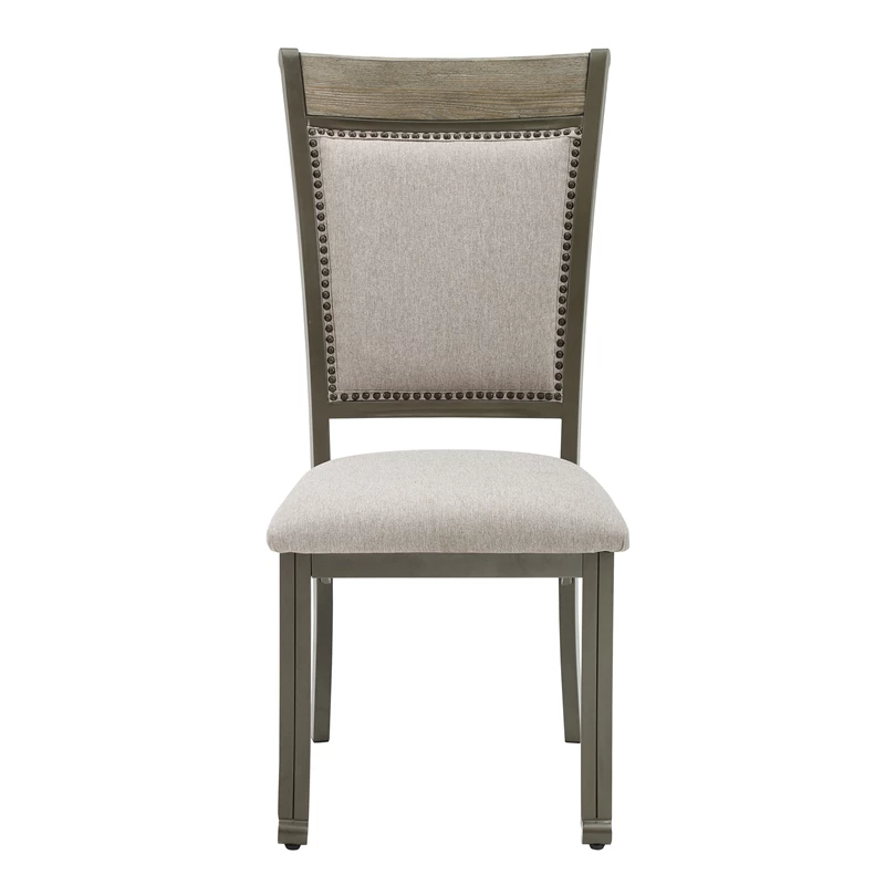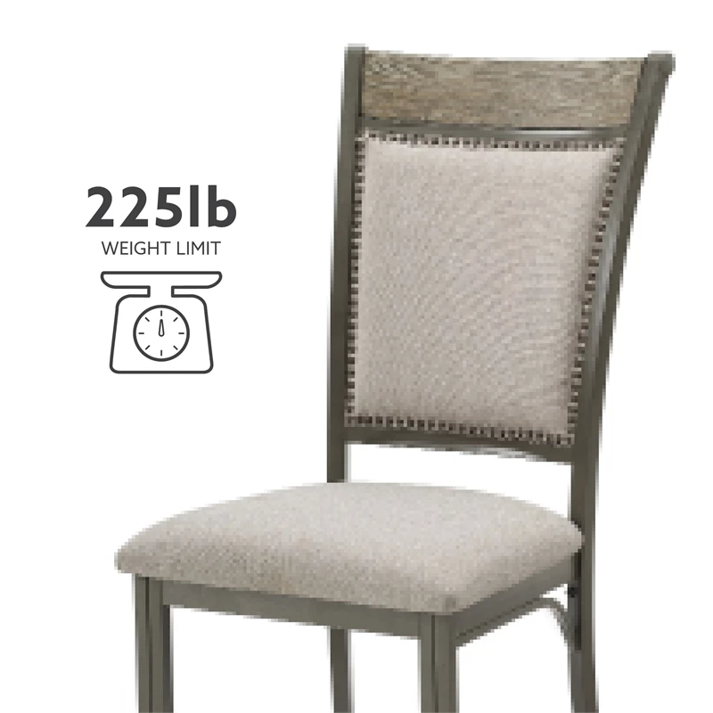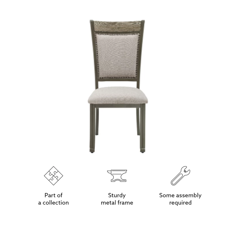Mixing metal, wood and performance fabric in an updated industrial style provides a unique addition to your home. Featuring a comfortable curved back with a padded support section that is upholstered with a grey fabric that resist stains and is easy to clean. Lined with nail heads and topped with a wood section that is in a grey finish. Padded seat in the same material make this a long lasting addition to any dining or extra seating situation. Created with a matching dining table. This is a two pack.