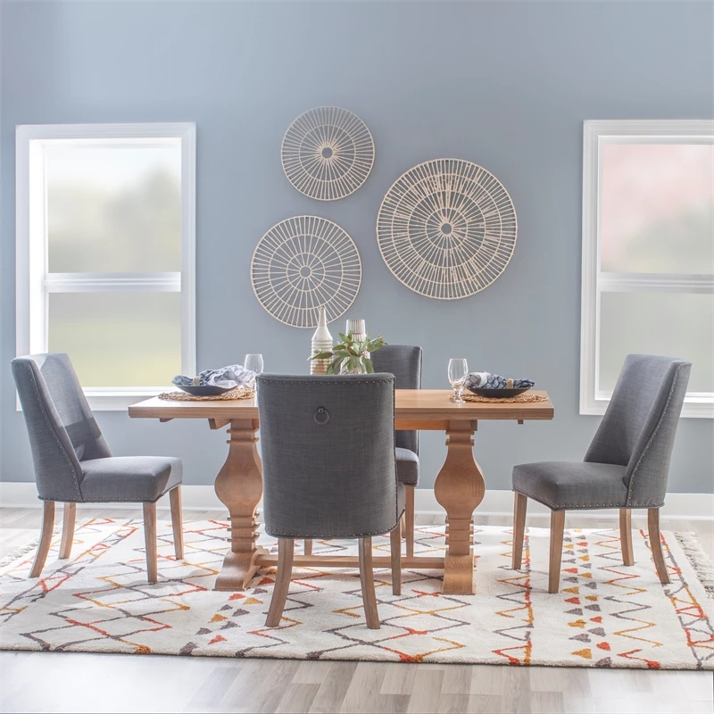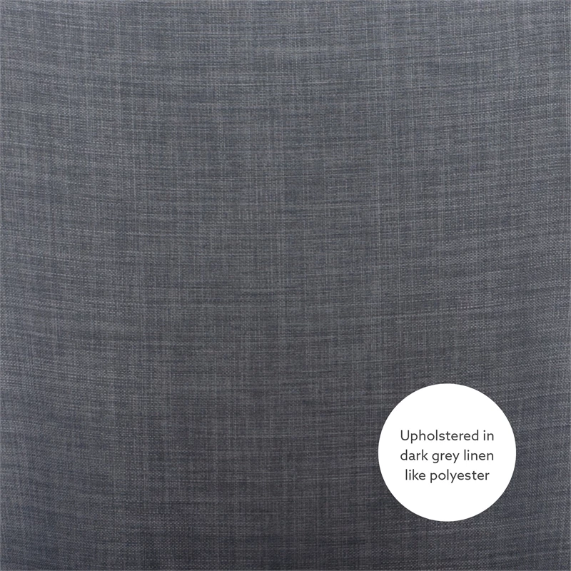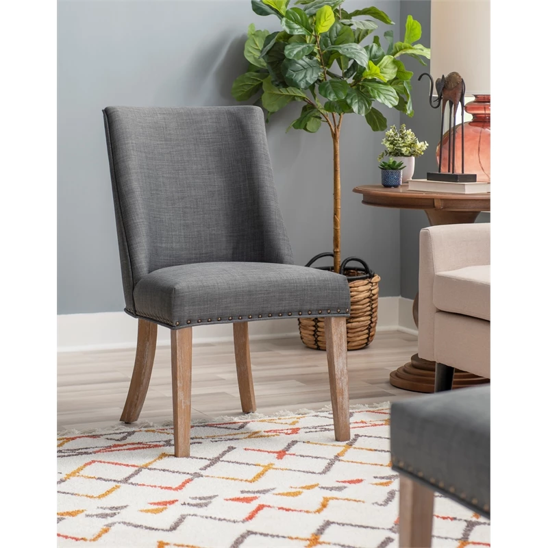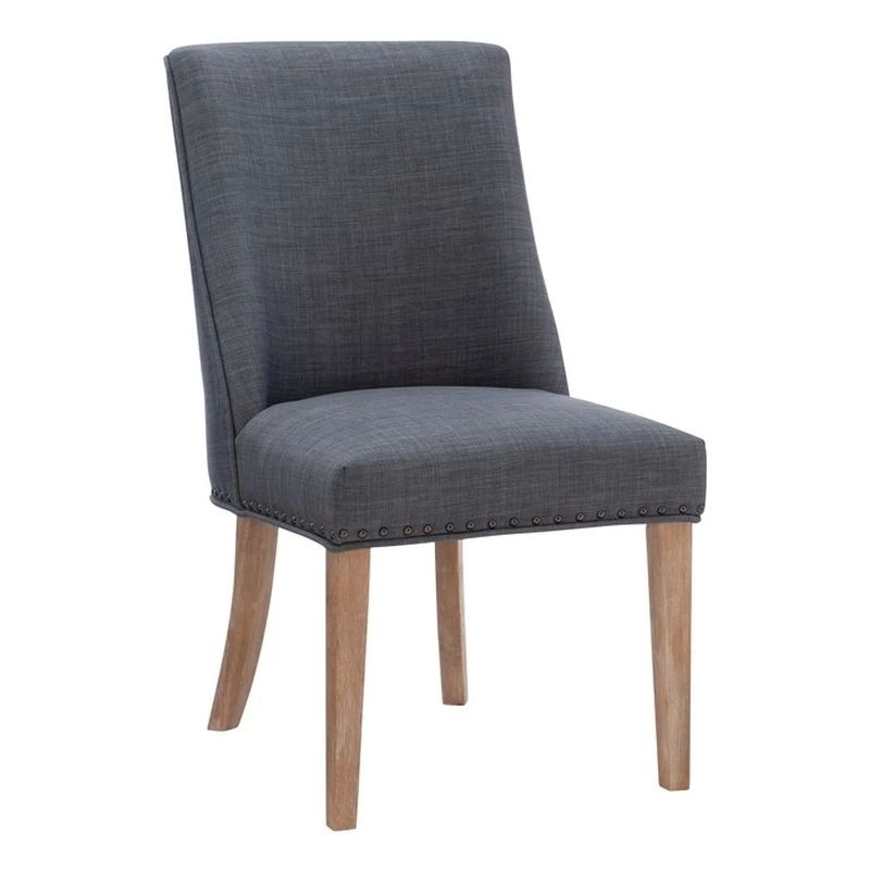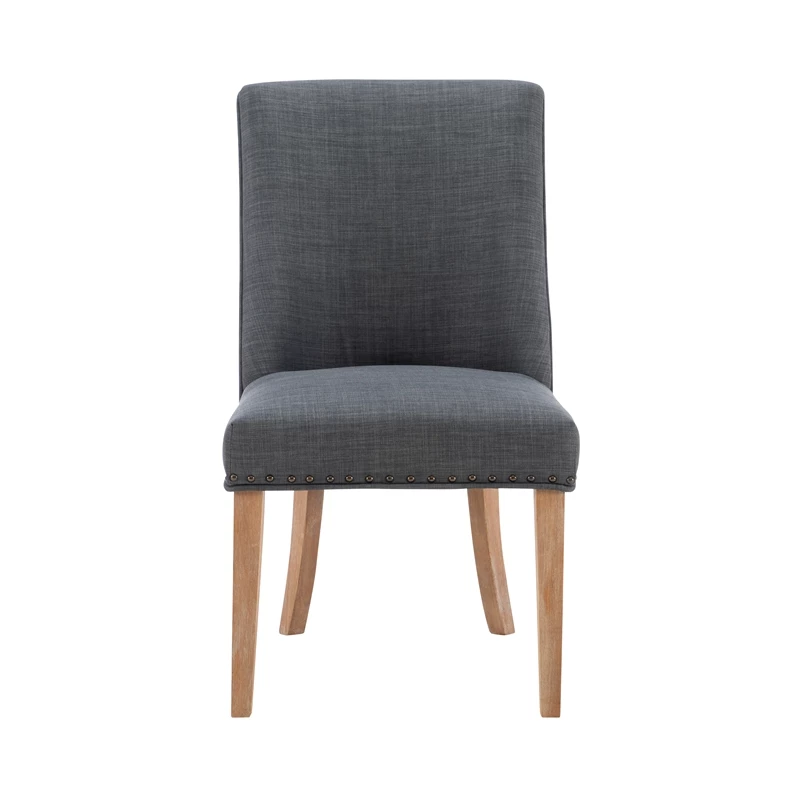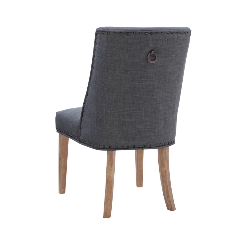 Add elegance to your meals with this sophisticated dining chair. Upholstered in dark grey linen like polyester, it features lovely antiqued bronze nailhead trim. The padded seat offers perfect comfort while being easy to clean. An arc shaped backrest adds to the comfort and pleasing design and solid wood legs, finished in a rustic natural, provide stability for hours on end. For a flawless finishing touch, you’ll find a decorative chair back ring pull. Sold as a set of two