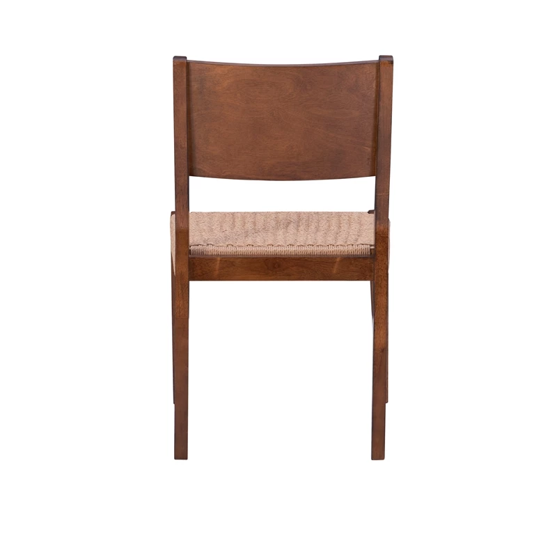 The sleek silhouette of this dining chair embodies the grace and simplicity of midcentury modern design, while the rope seats handwoven in an intricate basketweave pattern introduces a more rustic element. This unique blend of styles is further accentuated by the backrest; curved for comfort and stained in warm brown tones for a smooth finish. The chair stands on a set of solid wood legs and arrives in a set of two. A matching bench and table can be purchased to complete your midcentury dining ensemble.