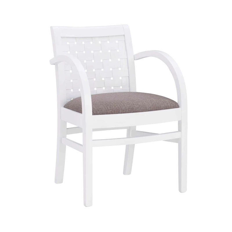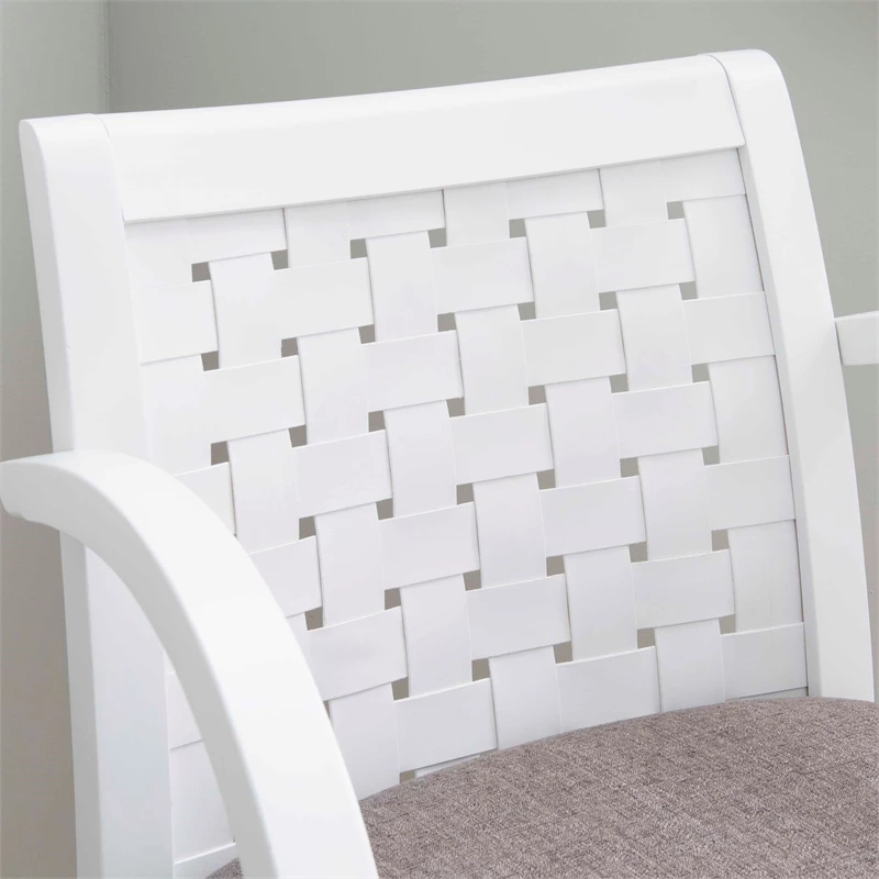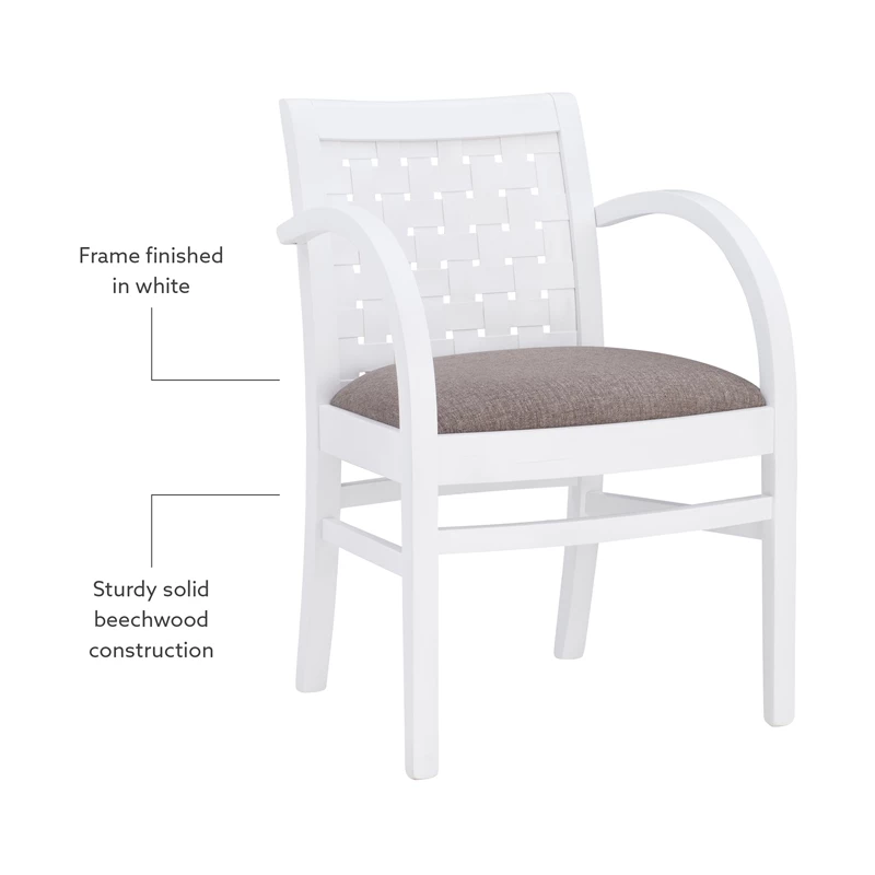 Reminiscent of classic woven strap armchairs, this accent chair adds a modern touch with beautifully curved arms and clean lines. It easily finds a home in a living room, bedroom or the like. Crafted from solid beechwood finished in a bright white, the accent chair offers plenty of comfort. Its seat is upholstered in dark grey woven polyester, which is easy to clean, and blends with nearly any color scheme. Comes fully assembled. Commercial Grade