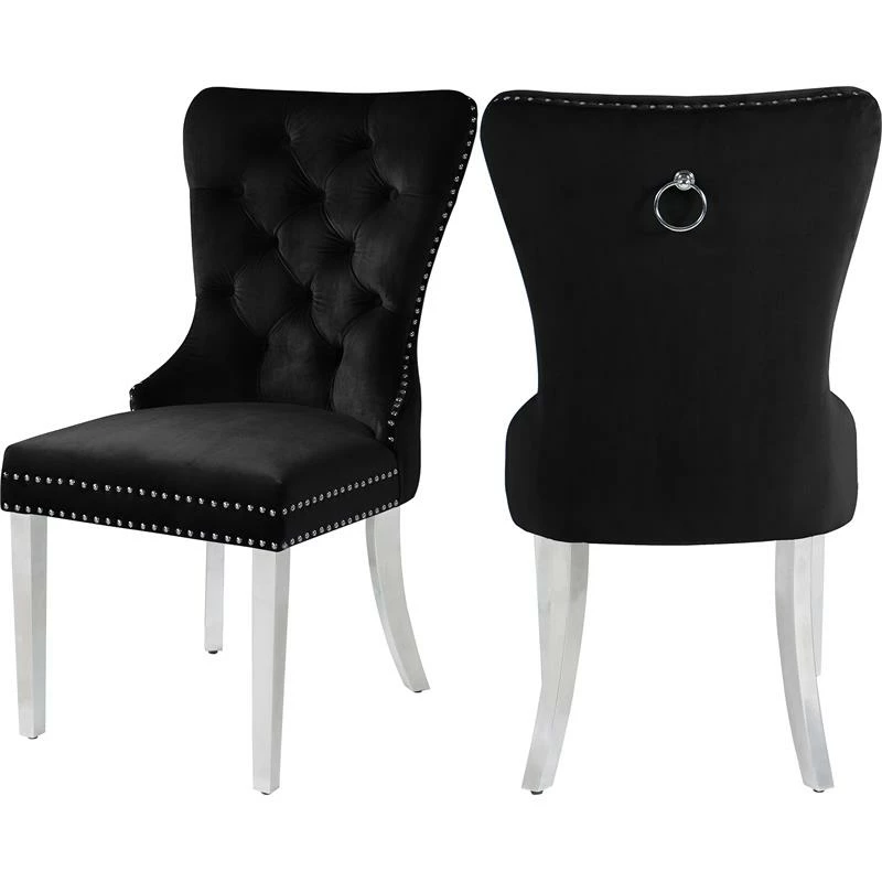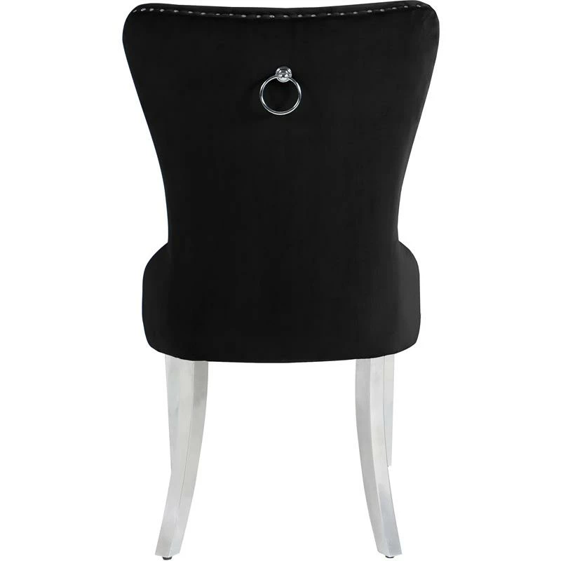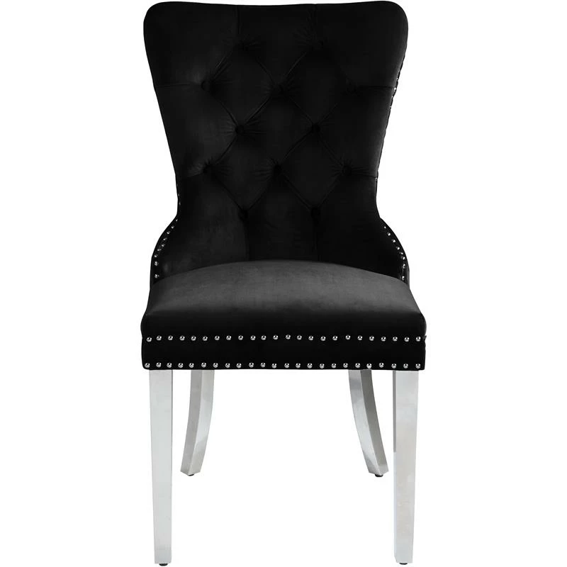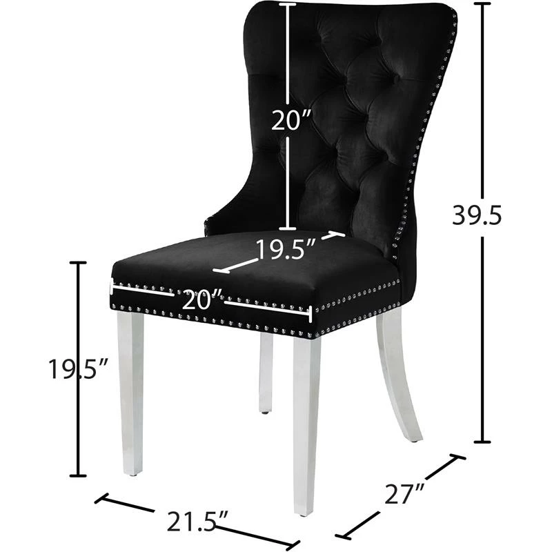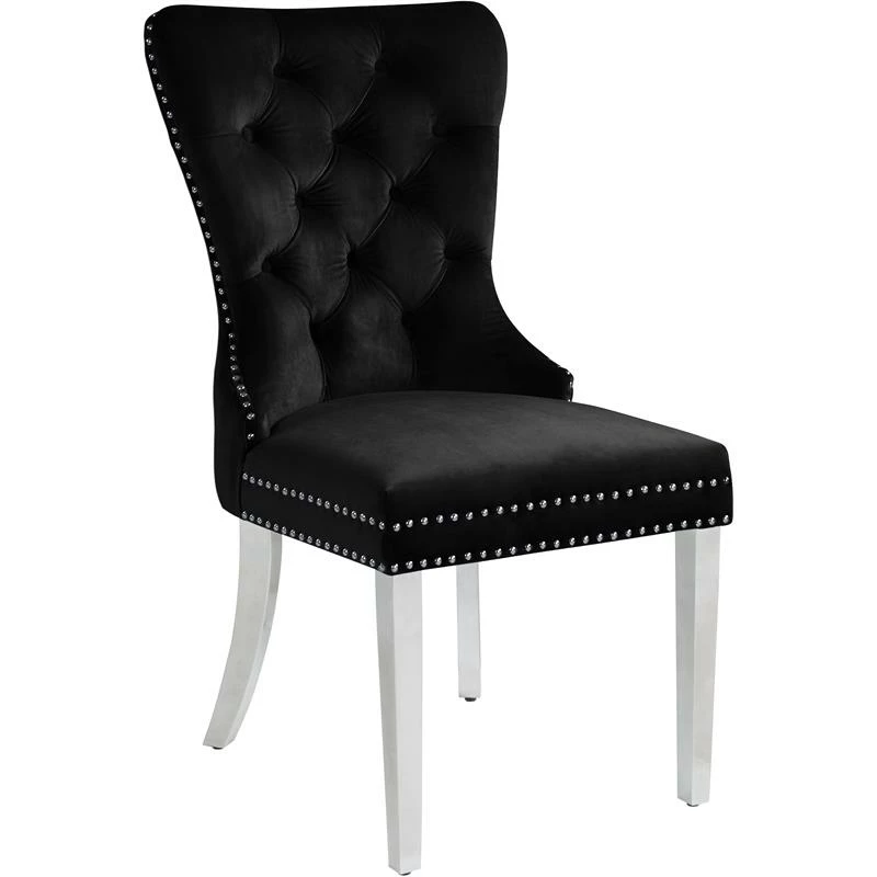 Transform your living space into a chic haven with this Carmen Velvet Dining Chair in Black. This eye-catching high-back chair offers plenty of back support, while its luxurious black velvet upholstery and deep button tufting provides a soft texture, enabling you to recline in comfort and elegance. Chrome metal legs provide sturdy, durable support, and a matching chrome knocker on the chair’s back gives it a unique, stylish touch that adds that extra bit of oomph to your contemporary home.