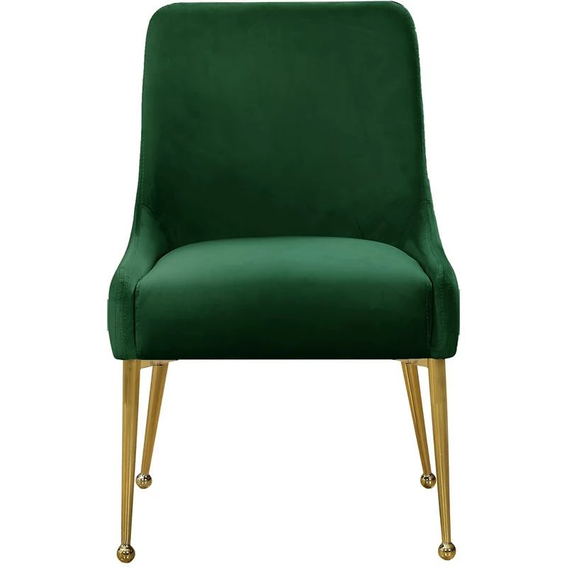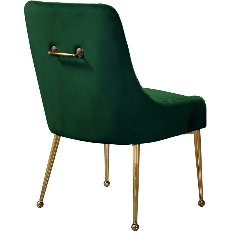 Revamp your dining space with this Owen Velvet Dining Chair in Green. Posh velvet upholstery covers every inch of this chair, giving it a svelte look that’s just the thing for modern decor. The polished gold legs have a ball design for added visual oomph, and a matching handle on the back adds an elegant detail while also providing an easy way to slide the chairs in and out from your choice of table.