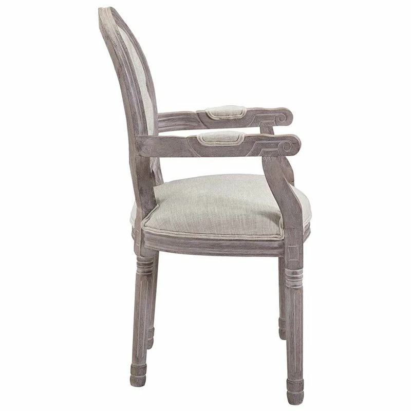Revel in the whispered opulence of the Arise dining arm chair. Featuring a fluted wood frame, button-tufted diamond trim, elegant welting, dense foam padding, an upholstered fabric seat, and scooped armrests, this oval back dining or accent chair elegantly blends old world charm with modern intrigue. Designed with a weathered vintage French look and an undeniable appeal, Arise supports up to 331 lbs and comes with foot pads to preserve flooring.