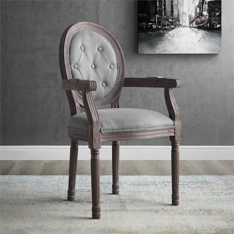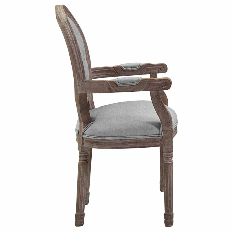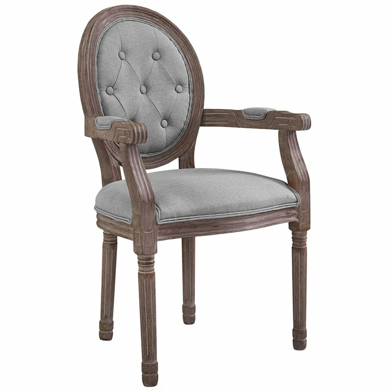 Revel in the whispered opulence of the Arise dining arm chair. Featuring a fluted wood frame, button-tufted diamond trim, elegant welting, dense foam padding, an upholstered fabric seat, and scooped armrests, this oval back dining or accent chair elegantly blends old world charm with modern intrigue. Designed with a weathered vintage French look and an undeniable appeal, Arise supports up to 331 lbs and comes with foot pads to preserve flooring.