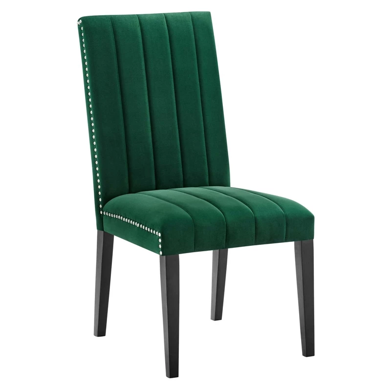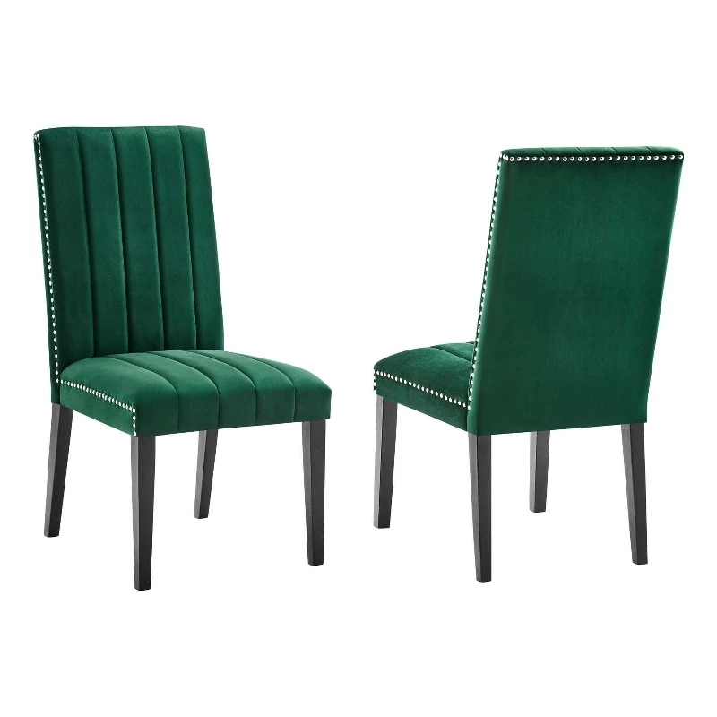 Soak up moments of joyful gatherings with the Catalyst performance velvet dining side chairs – set of 2. Abounding in luxe modernity and glam deco style, this dining chair set features vertical channel tufting and nailhead trim. These upholstered parsons chairs are covered in soft, stain-resistant performance velvet and feature dense foam padding and a sinuous spring support system for a premium seating experience. A beautiful addition to the dining table, these velvet chairs can also serve as desk chairs or accent chairs in the living room. Includes non-marking foot caps.