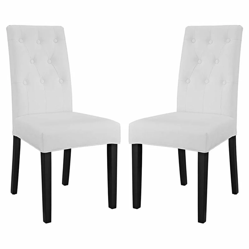 Endow your dining room with something delightful. The Confer modern dining chair combines dense foam with fine faux leather upholstery for a singular piece of elegance. Fashioned with eight tufted buttons and supported by stained hardwood legs, Confer is a richly designed piece that blankets your dining experience in a layer of magnificence.