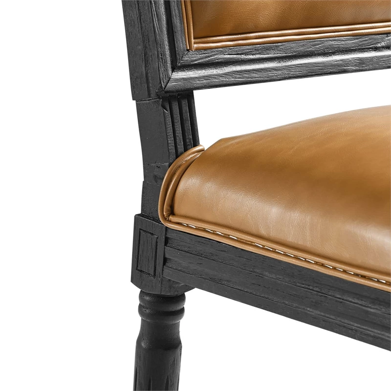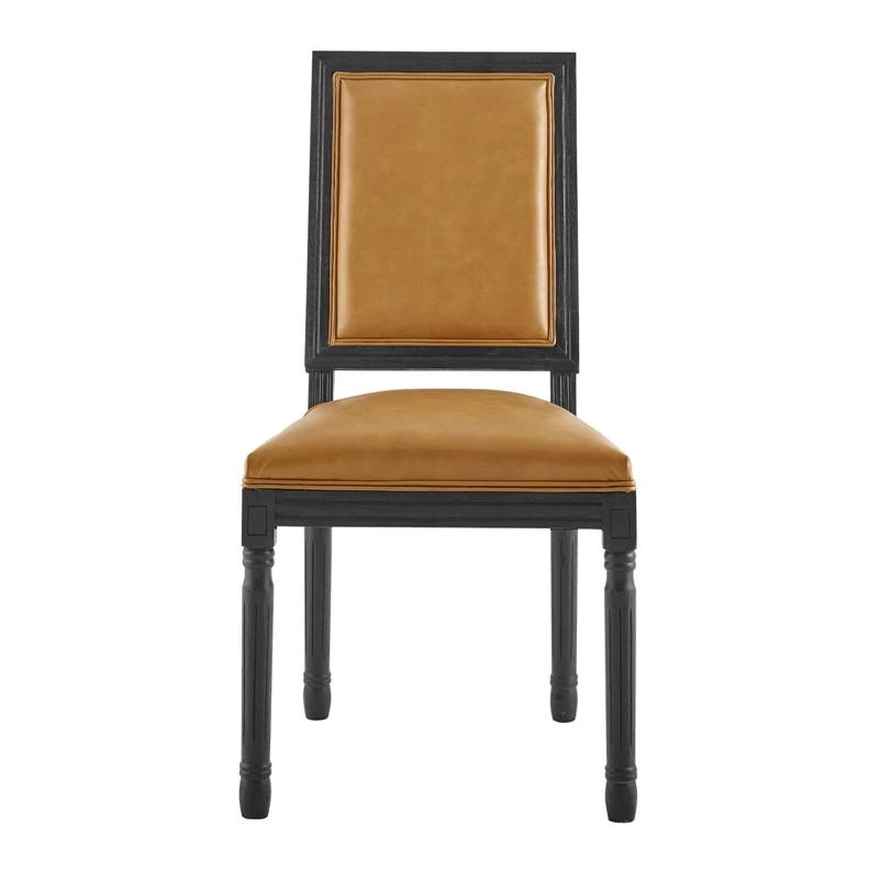 Revel in the whispered opulence of the Court dining side chair. Featuring a fluted wood frame, dense foam upholstered vegan leather seat with elegant welting, this square back dining or accent chair harmoniously blends old world charm with modern intrigue. Designed with a vintage French look and an undeniable appeal, Court supports up to 331 pounds and comes with foot pads to preserve flooring.