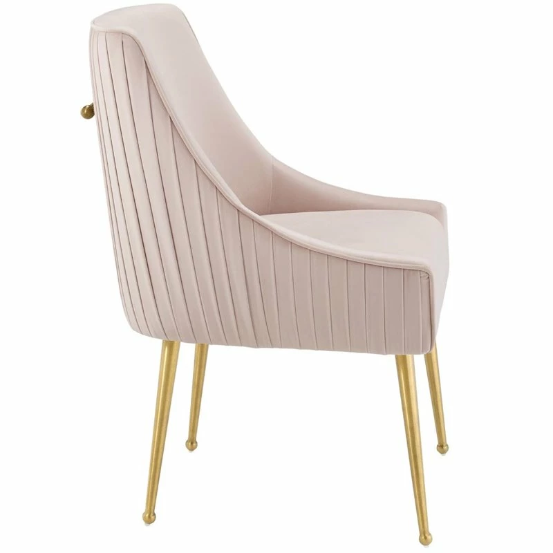 Gently sloping arms cascade down from the flowing design of the Discern Performance Velvet Pleated Back Dining Chair. Solidly constructed from wood and plywood, Discern comes with dense foam padding upholstered in stain-resistant performance velvet. Complete with splayed brushed gold stainless steel legs and matching decorative handle on the back of the chair, Discern is a soft and durable addition to the dining room, kitchen entryway, living room, bedroom, home office, or vanity. Create a cozy seating experience with this versatile dining accent chair with non-marking foot caps.