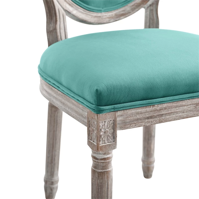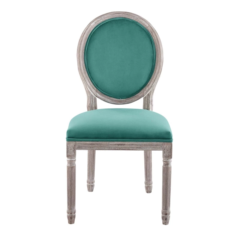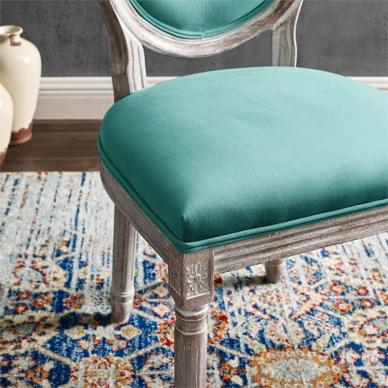 Revel in the whispered opulence of the Emanate dining side chair. Featuring a fluted wood frame, dense foam upholstered performance velvet seat with elegant welting, this oval back dining or accent chair elegantly blends old world charm with modern intrigue. Designed with a weathered vintage French look and an undeniable appeal, Emanate supports up to 331 pounds and comes with foot pads to preserve flooring.
