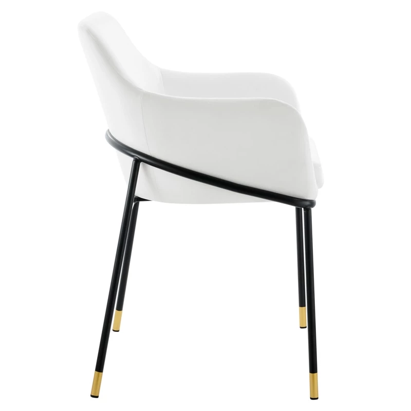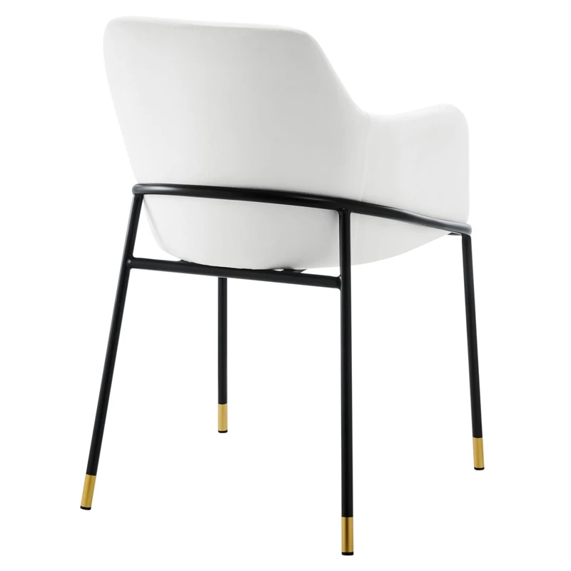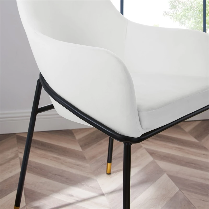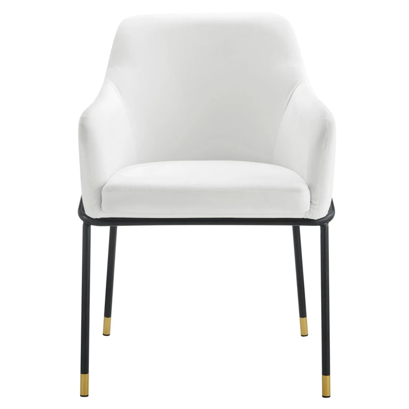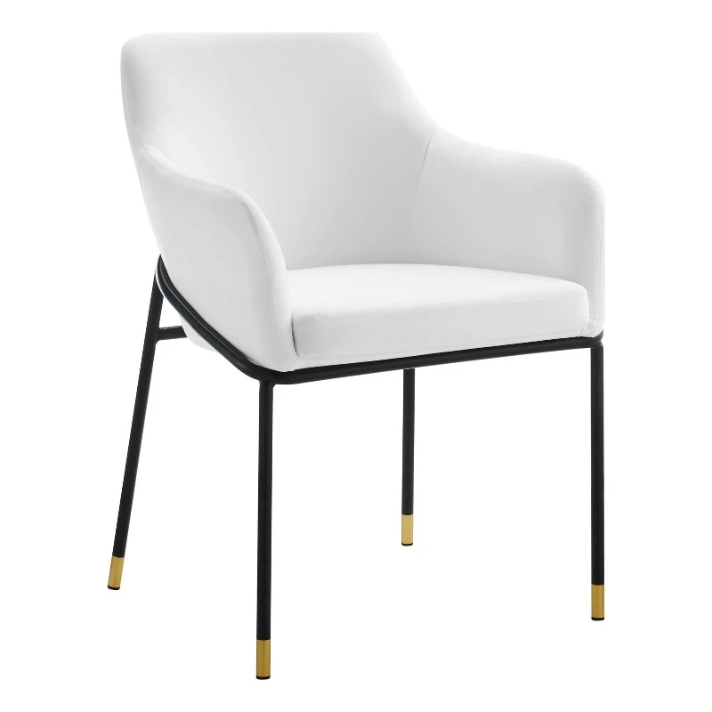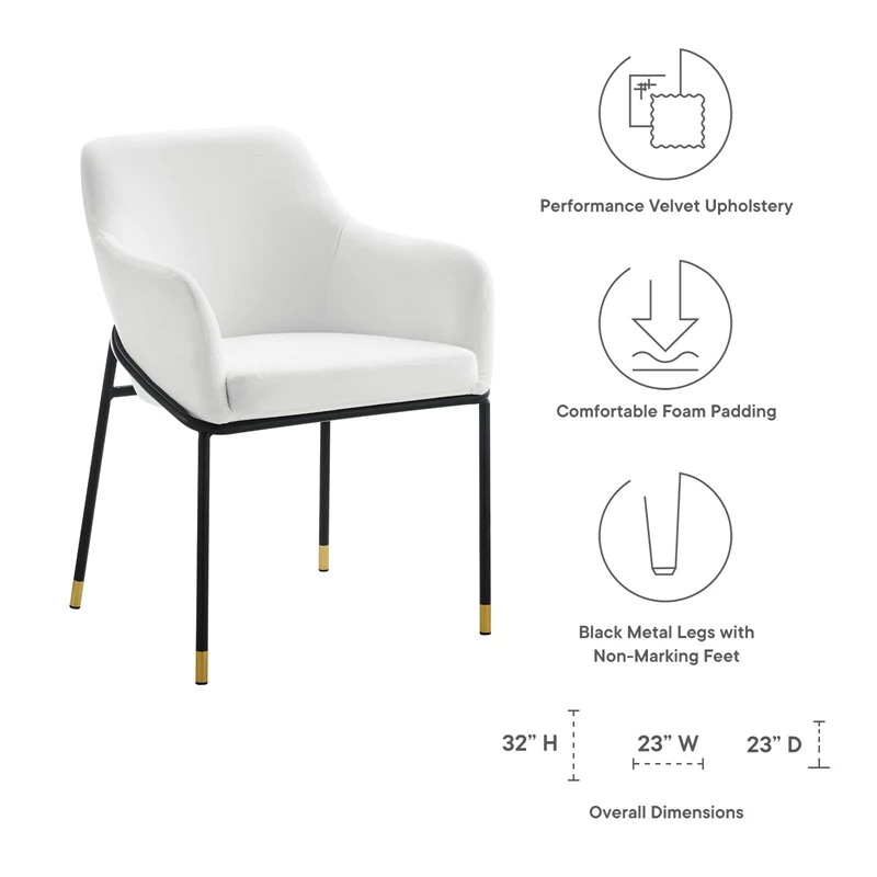 The clean lines and smooth curves of the Jovi performance velvet dining armchair unite to make this a stylish addition to your dining room or an alluring accent in your living room or hallway. Minimalism meets glam deco style to create this tasteful dining chair that complements your mid-century, modern, or transitional decors. This retro modern dining chair rests on black powder-coated metal legs with gold accents that blend beautifully with the stain-resistant performance velvet upholstery. The captivating curves of the arms and back convey movement while the padded seat cushion evokes restfulness. The Jovi performance velvet dining armchair comes with non-marking foot pins to protect your flooring.