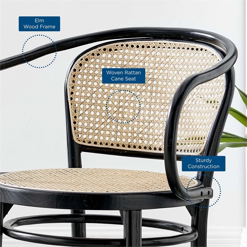 A whimsical addition to your dining space, the Oliana wood dining chair blends coastal charm with modern farmhouse style. With a rounded frame crafted from solid elm wood, this side chair features a woven rattan cane seat and backrest that creates an airy design. This wood chair is a versatile choice for the modern home, making a statement around the dining table or as an accent chair in the living room, office, entryway, or other seating area. Includes non-marking foot caps.