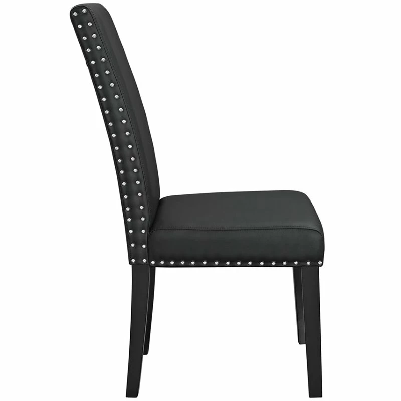 Wrap up moments of quality seating with the Parcel dining chair. Finely upholstered in faux leather with a nail-head trim, Parcel delivers a concise offering that enhances the dining experience in a subtle and unassuming way. Padded with dense foam and solid stained wood legs.