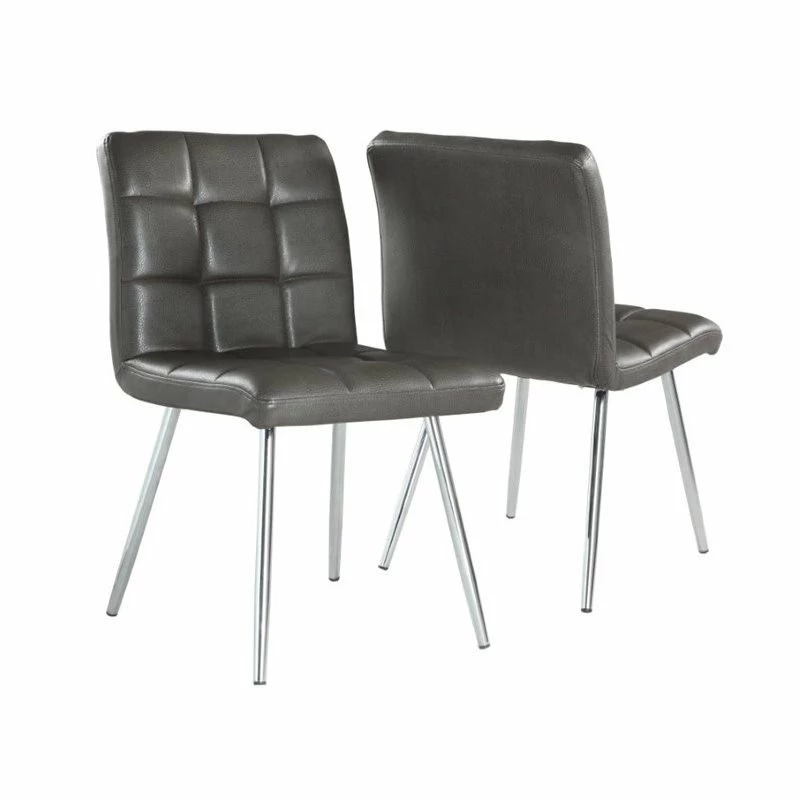 Bring a touch of modern elegance into your home with the clean design of these contemporary grey leather look dining chairs. Featuring a soft quilted seat and back and sleek, sturdy chromed metal legs these chairs will easily have you dining in style.