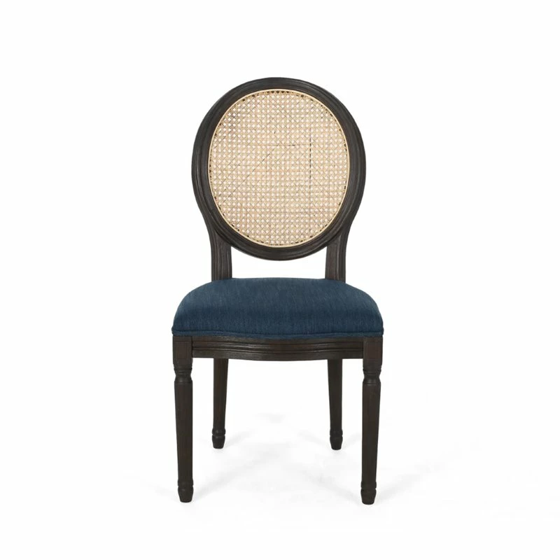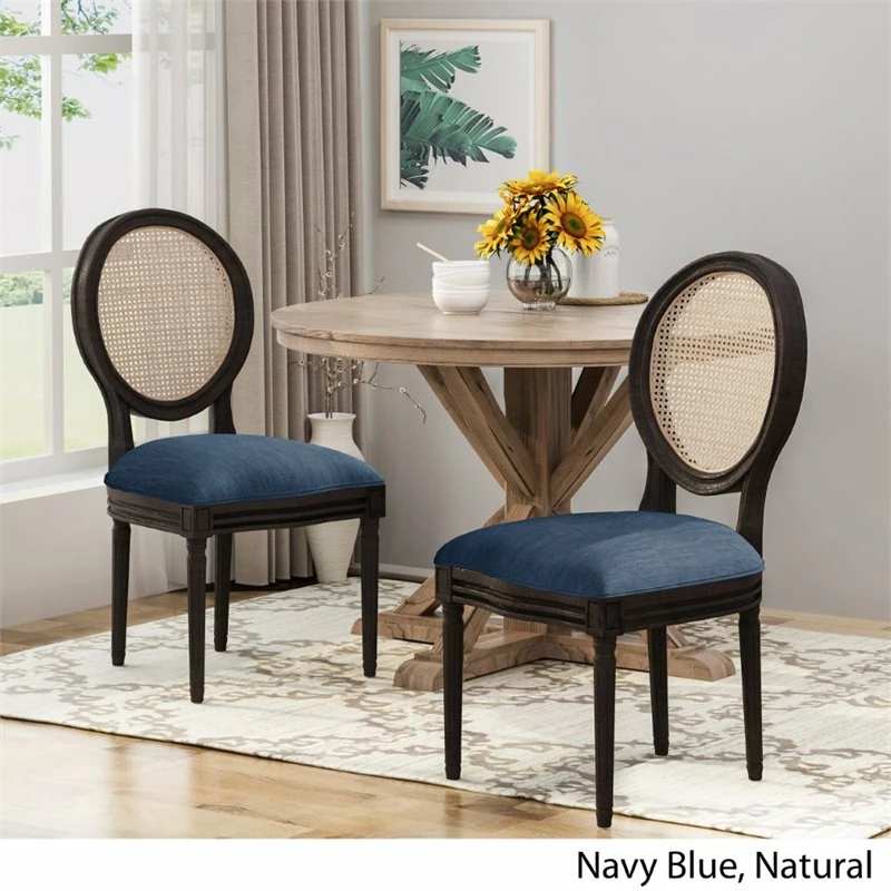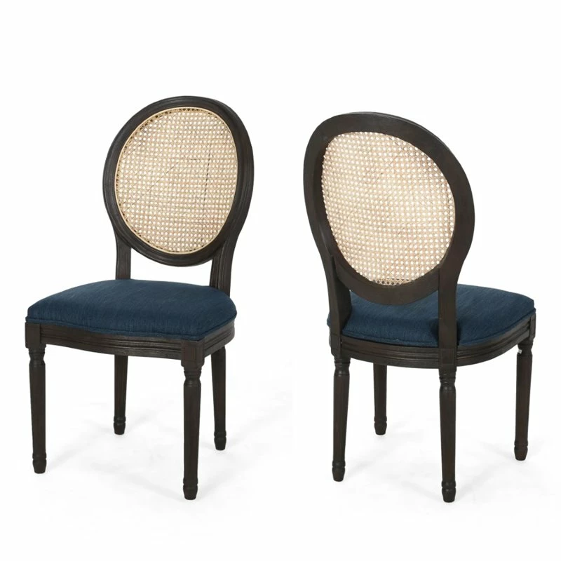 Dazzle your dining set in a touch of elegance with our stunning set of chairs. Our chairs combine classic elements for a unique design with a stunning mix of wicker and smooth fabric upholstery. From exquisitely carved legs to its distressed finish, our dining chair will instantly uplift the ambiance of your kitchen or dining room. Whether you are casually eating with your family or having guests over for a dinner party, our chair set will have you set in style and comfort. TRADITIONAL INSPIRATION: This dining chair brings vintage inspiration to your dining set with its distressed finish and simple design. Including beautifully carved legs and a rounded backrest, this chair offers a timeless atmosphere for any interior space. RUBBERWOOD LEGS: Our environmentally-friendly wood not only offers plenty of durability, but it also gives this piece a beautiful natural-grain look. Combined with a gorgeous finish, this wood will truly stand out in any room. WICKER BACKREST: Featuring a long-lasting woven backrest, this natural style is perfect for an organic look. The handcrafted details of the wicker bring a homemade, classic feel to your dining space. TURNED LEGS: To complete the look, this chair set offers turned legs that provide both style and stability, emphasizing its vintage look. The ornately carved legs give this piece a perfect hand-crafted touch. ASSEMBLY REQUIRED: Some assembly is required for this chair set. All of the instructions and tools needed for assembly are included. This comes as a set of two.