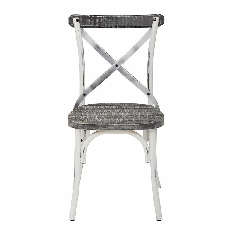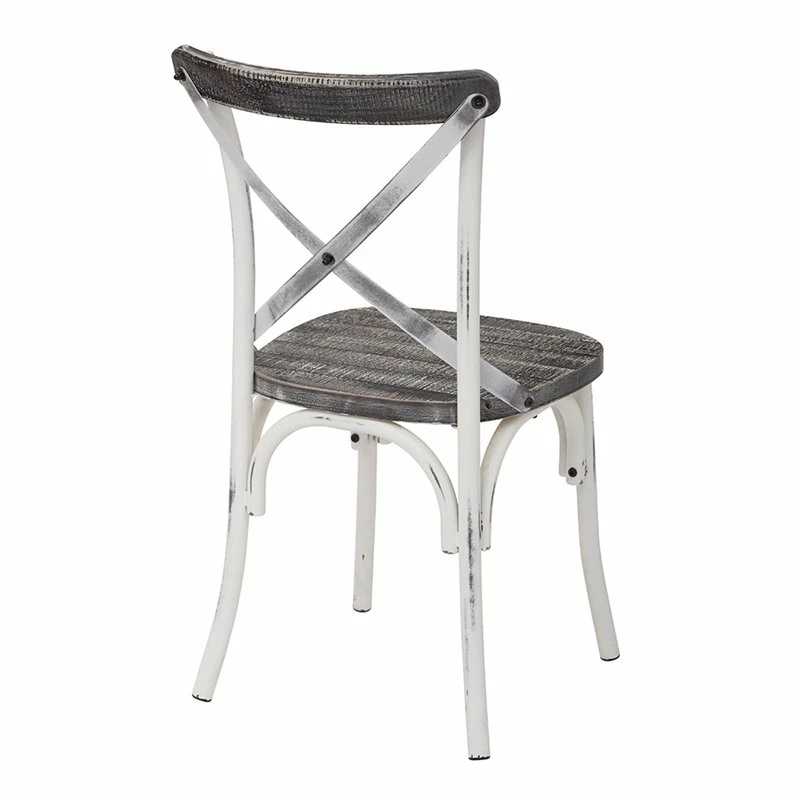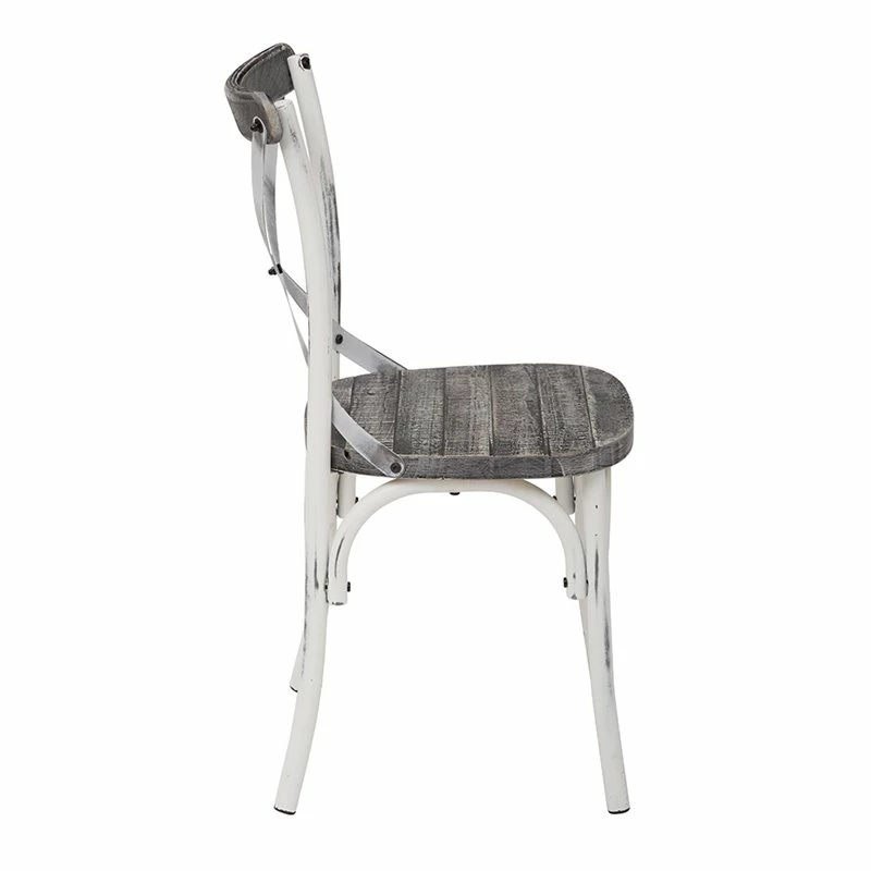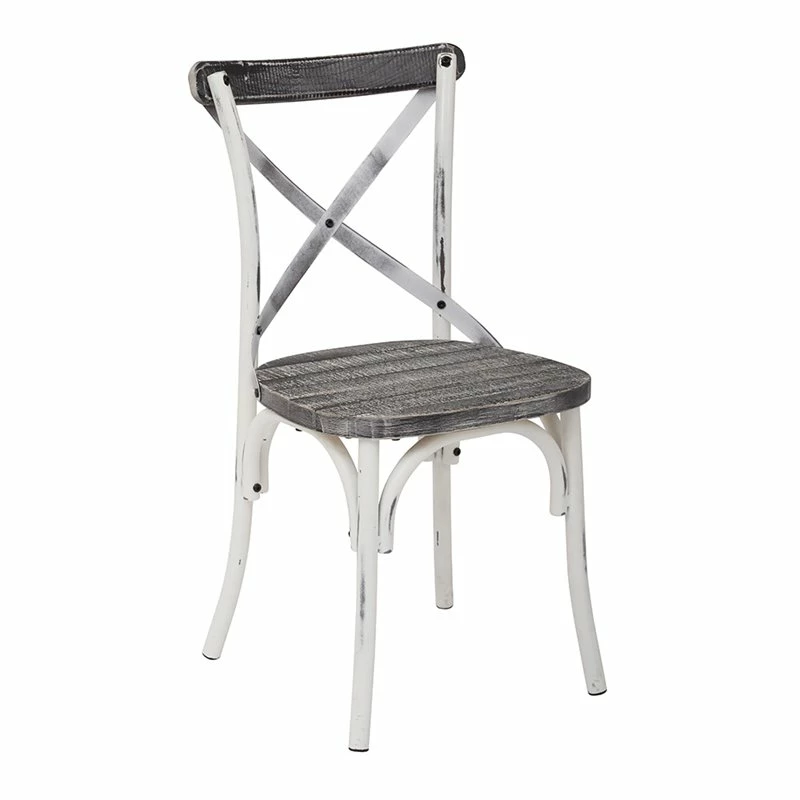 Somerset X Back Antique White Metal Chair with Hardwood Vintage Seat Finish Update the look of your home with the OSP Designs Somerset X Back Antique Metal Dining Chair. Featuring an effortless mix of color and natural wood elements, this chair is the perfect mix of rustic and industrial. Numerous styling elements make this chair’s shabby chic aesthetic all the more charming. These elements include a unique X back design and curved edges. A hardwood seat, in a Vintage crazy Horse finish, accompanies the chair’s antique frame. The same walnut wood can be found on the top of this chair’s back. Surround a traditional farmhouse table with a number of these stylish chairs or create a bistro set with two and a small table.