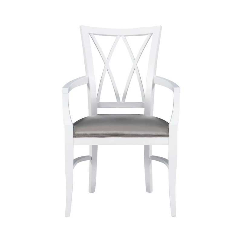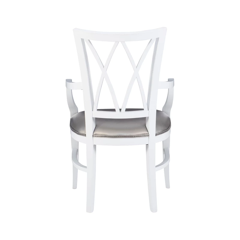 Create an inviting atmosphere in your dining room with this lively armchair. Outward curving armrests follow the contours of the wide cushion seat to make the perfect perch for sitting back and relaxing. The cushion is upholstered in charcoal faux leather for added comfort and easy cleaning, while the white beechwood frame offers long term strength and stability. An ornamental backrest contributes to a traditional aesthetic without making the piece feel outdated. Classic, yet renewed, this chair is a great fit in a variety of decor settings.