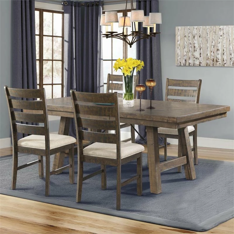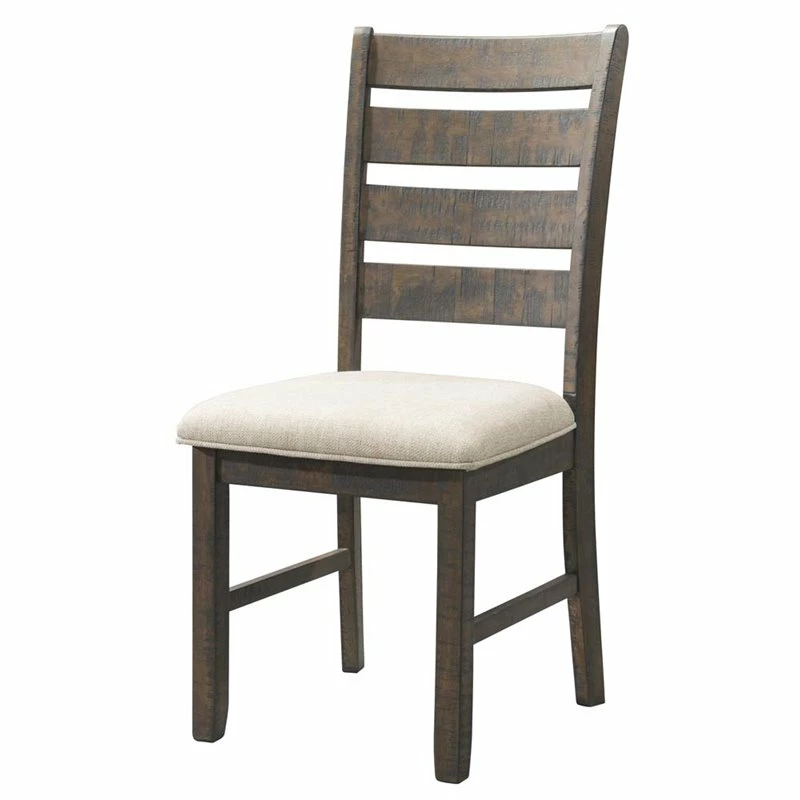 The Picket House Furnishings Dex Ladder Back Chair Set gives your dining room a hint of rustic charm.Its comfy seat is upholstered in a cream, linen-like fabric and accented by a wooden slat panel back. Its smokey walnut finish and distress marks give this chair a weathered and cozy look.