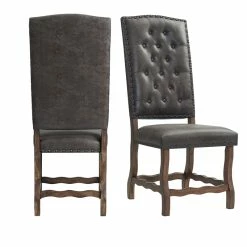 The Picket House Furnishings Hayward Tufted Tall Back Side Chair Set will look great in your dining room! These chairs feature a faux leather upholstered seat and back in a rich, chocolate color. The faux leather is distressed, instantly adding character and charm to this chair duo. Slate, nail head trim outlines the back and seat of the chairs while the back cushion is tufted, instantly adding extra flair to this already stylish set. The foam cushion seat and back will keep you plenty comfy during even the longest of dinners. The natural wood grains and warm, walnut finish complete the look.