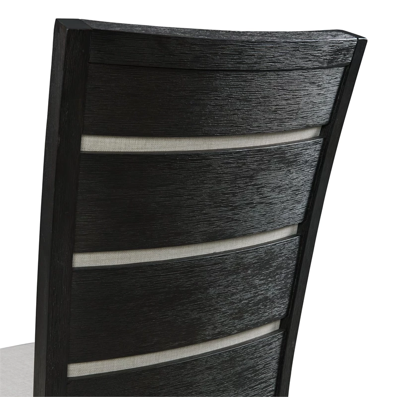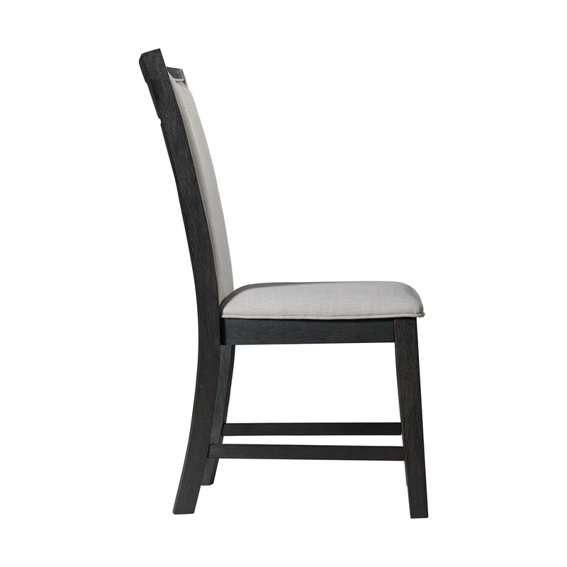The Picket House Furnishings Jasper Slat Back Side Chair Set is the missing piece to your Jasper Dining Table! This duo includes two chairs. The cool feature about these chairs, is not only is the inside of the back upholstered, but so is the outside of the back and its covered with wooden slats. This provides the style you crave without losing comfort thanks to the foam cushion back. The gray upholstery pairs perfectly with the rich black finish; making it easy to match with any existing decor. Add this super stylish duo to your home today for a look that will last year after year.