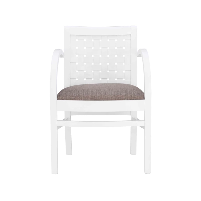 Reminiscent of classic woven strap armchairs, this accent chair adds a modern touch with beautifully curved arms and clean lines. It easily finds a home in a living room, bedroom or the like. Crafted from solid beechwood finished in a bright white, the accent chair offers plenty of comfort. Its seat is upholstered in dark grey woven polyester, which is easy to clean, and blends with nearly any color scheme. Comes fully assembled.