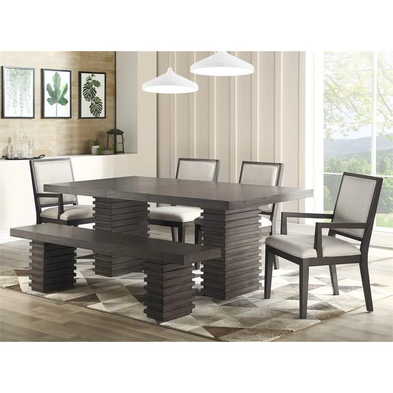 Entertain your family and friends with the bold contemporary styling of Mila. The Mila Dining Arm Chair features a fashion-forward washed gray finish over hardwood solids and ash veneers, pairing beautifully with the beige polyester back and seat. The chair features a stylish framed wood back that looks as good from the back as from the front and complements the geometric design in the table’s trestle base. Your purchase includes two dining arm chairs.