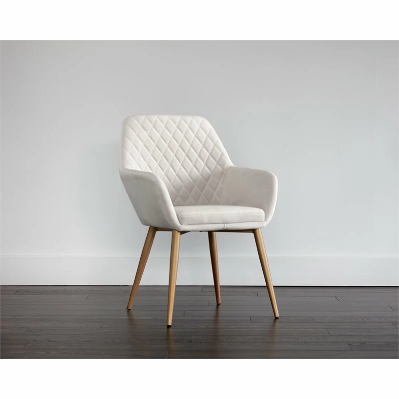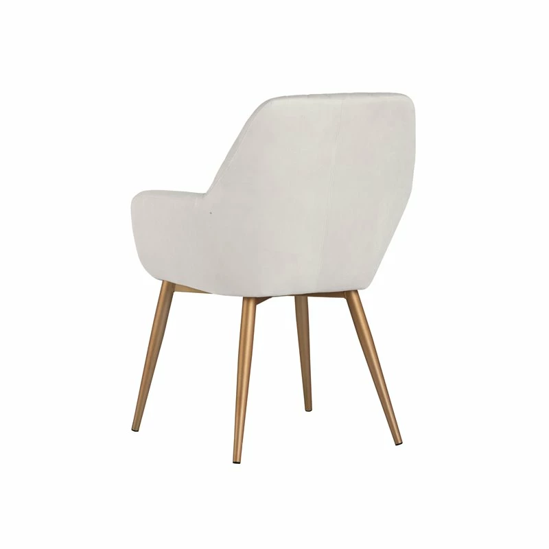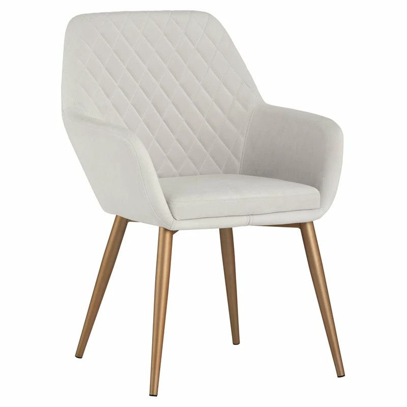 A chic and comfortable dining armchair from our Urban Unity collection. Features beautiful diamond tufting on the seatback. Stocked in polo club stone fabric with brushed black steel legs and in antonio linen fabric with painted champagne gold steel legs. Champagne gold steel has a warm undertone.
