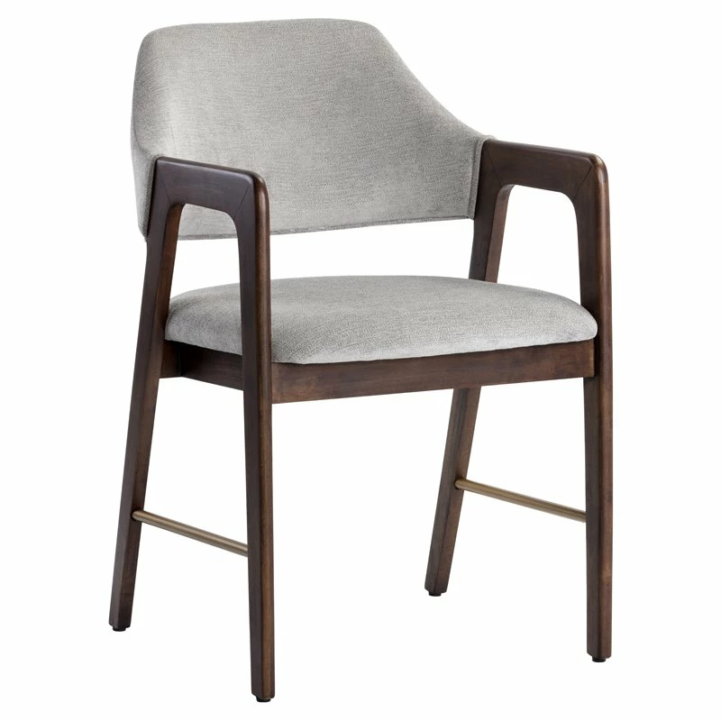 This mid-century modern dining chair from our Zenn collection combines luxury and warmth. Stocked in bravo cream faux leather, leo olive fabric or polo club stone performance fabric with an exposed solid rubber wood frame and antique brass stretchers. Performance fabric is moisture resistant, stain resistant and easy to clean.